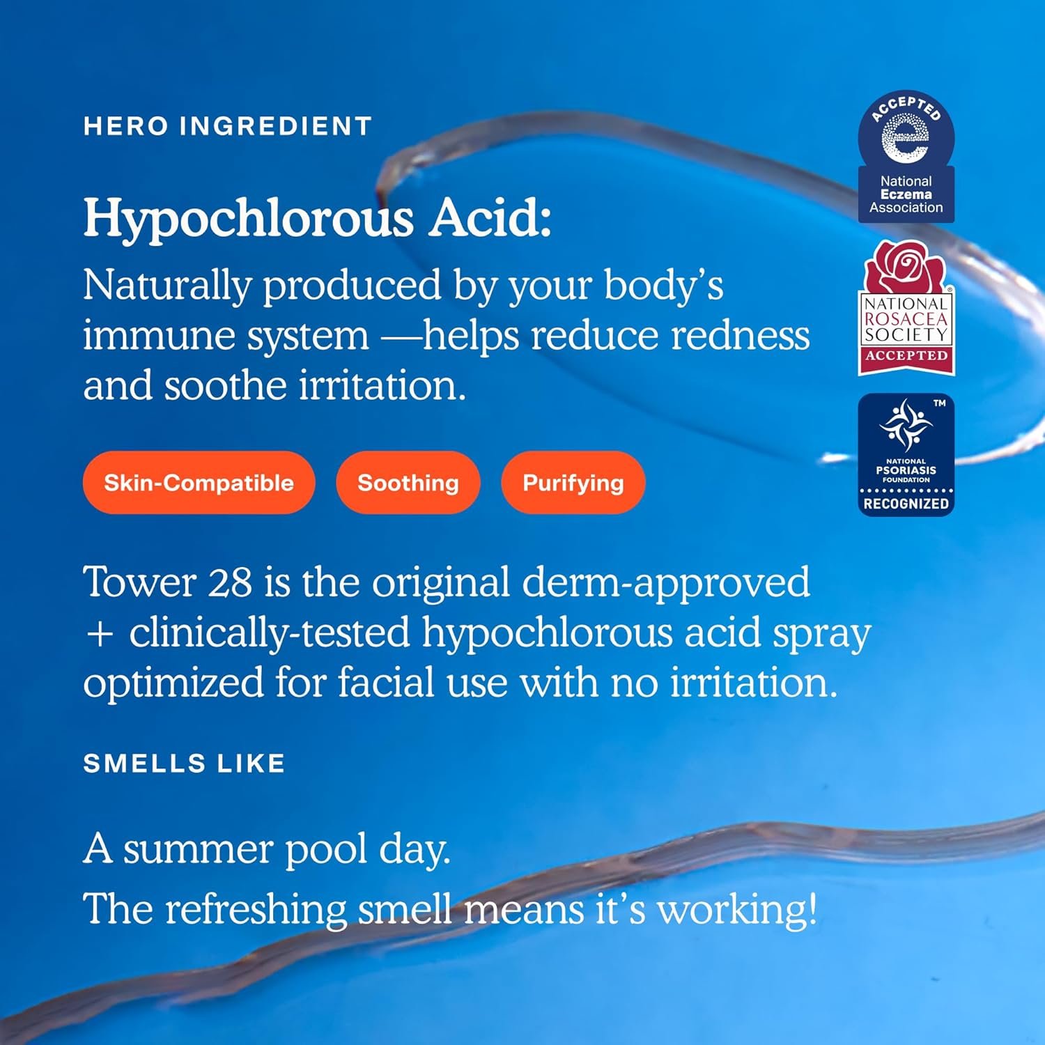 How To Use: Add this Tower 28 facial spray to your skincare routine in the AM/PM after cleansing in place of toner; Use hypochlorous acid spray for face whenever, wherever over makeup, for blemishes, post-workout and much more