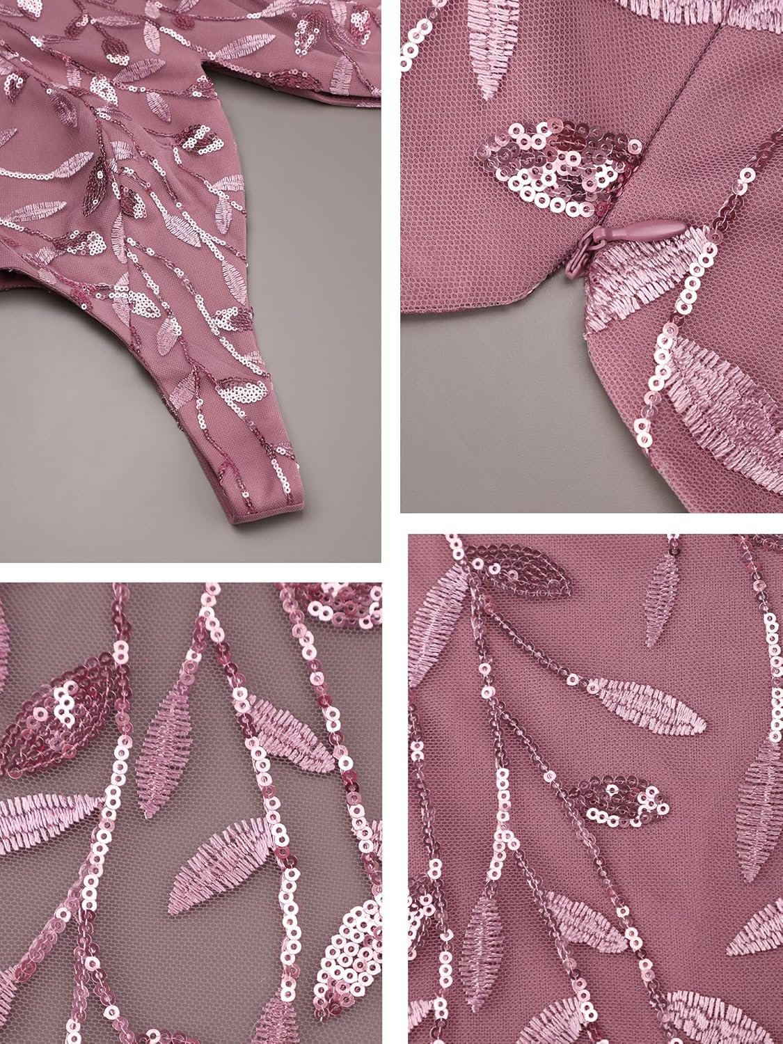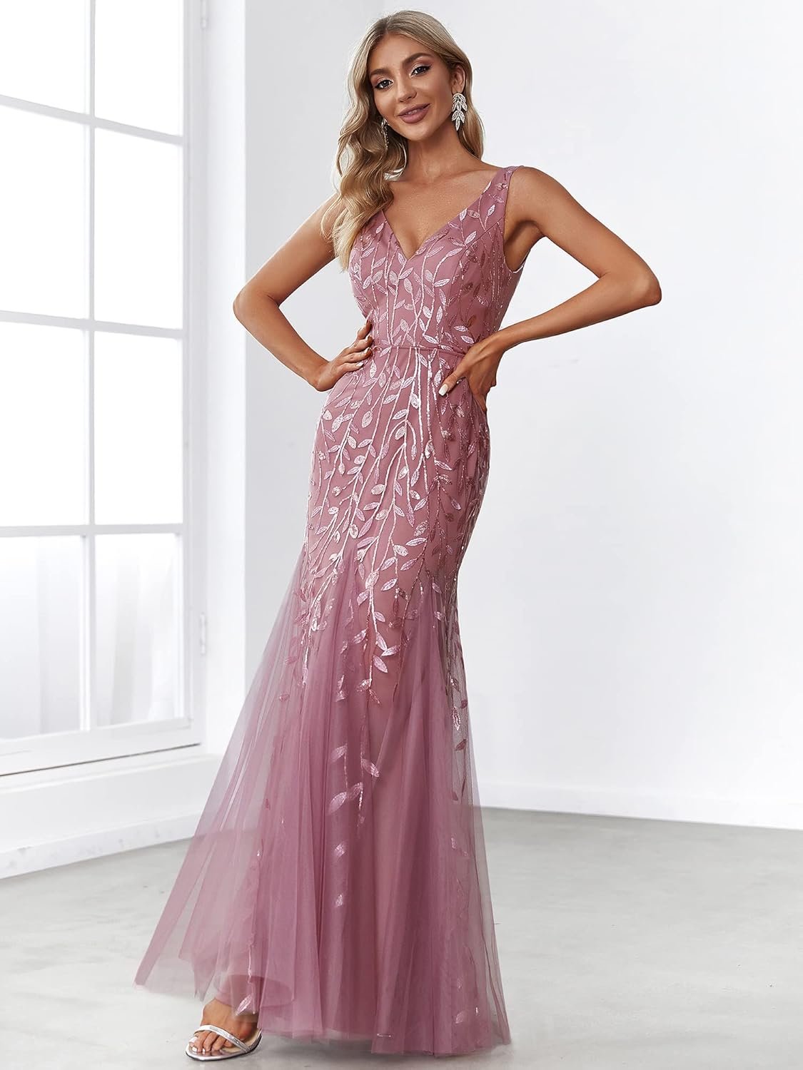 This sexy sequined tulle evening dress features a deep v neckline and fishtail skirt, the shimmery leave design also adds a romantic vibe.