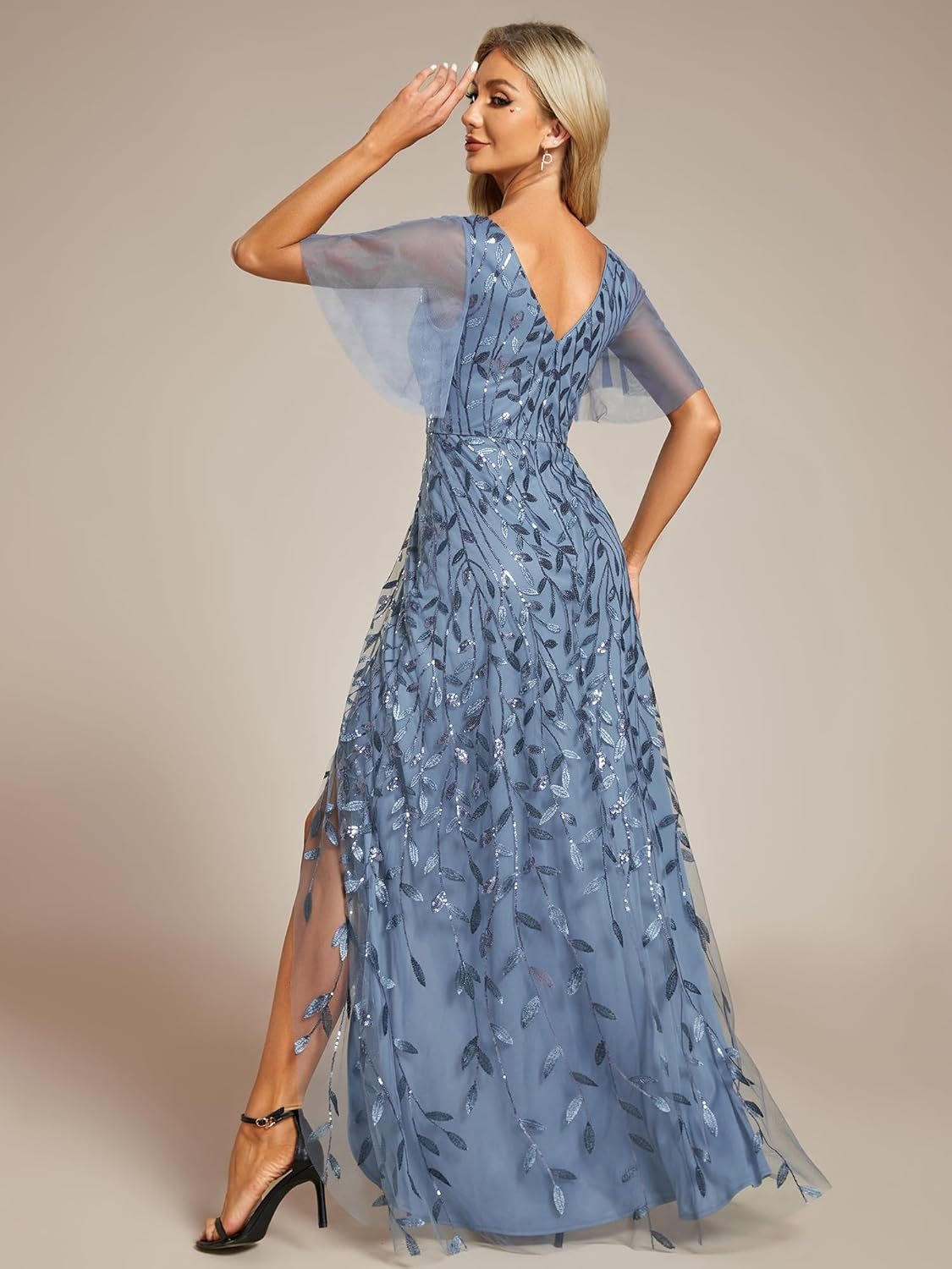 This shimmery sequins long evening gowns features a double deep v neckline, ruffles sleeves and side slit. The stunning leave design gives a romantic vide. No matter what occasion, this long tulle evening dress with slit will make you look gorgeous and elegant!