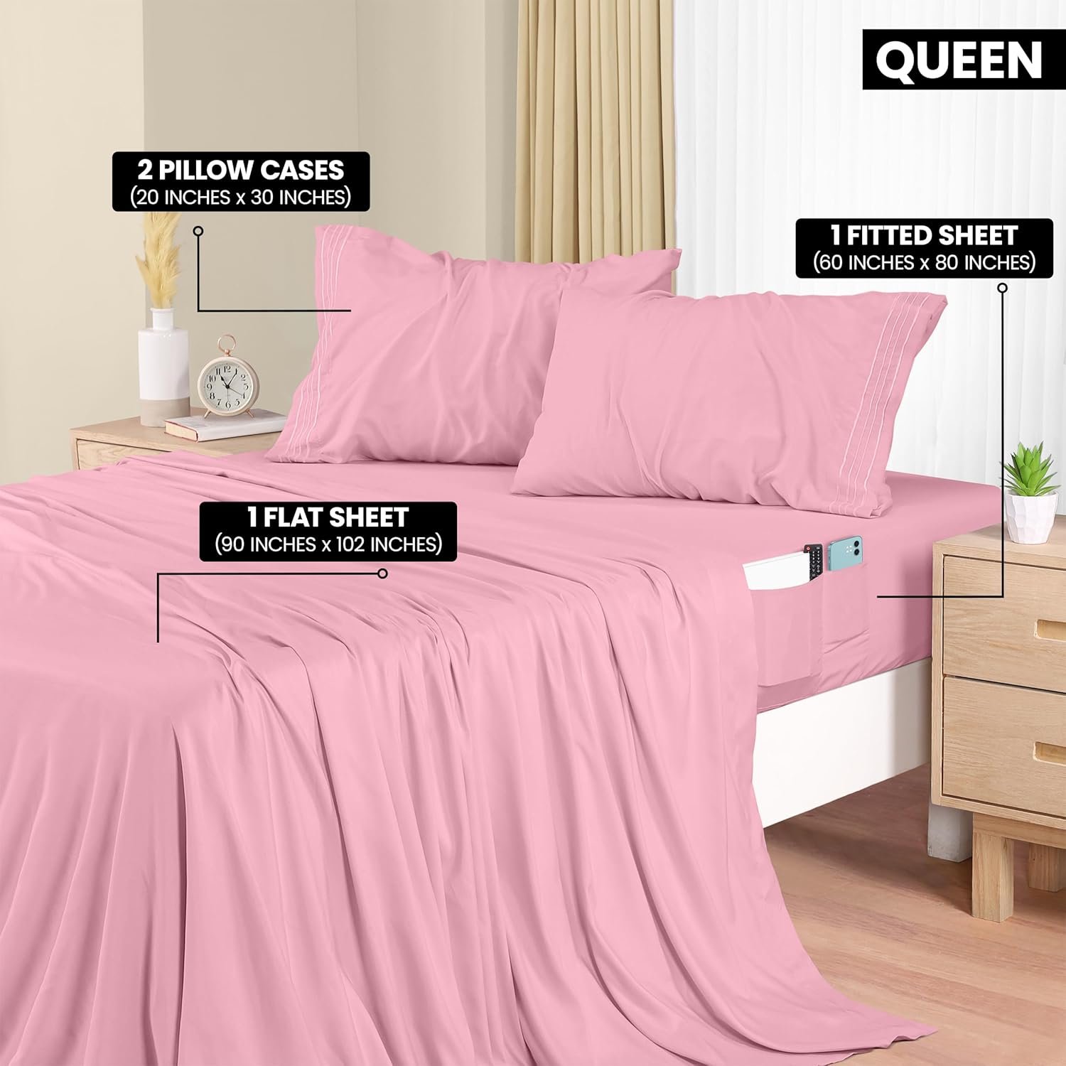 Luxury 4 PC Queen Bed Sheet Set – Utopia Bedding 4-piece Queen Sheets Set comprises of 1 flat sheet (90 by 102 inches) with a 2 inches self-hem, 1 fitted sheet (60 by 80 inches) with a 15 inches Deep Pocket / box for over-sized bedding and 2 exquisitely embroidered pillowcases (20 by 30 inches each) with a 4 inches hem. Redefine and uplift your bedroom style with this timeless bed sheet set, offering ultimate comfort, extraordinary appeal and a heavenly sleep.