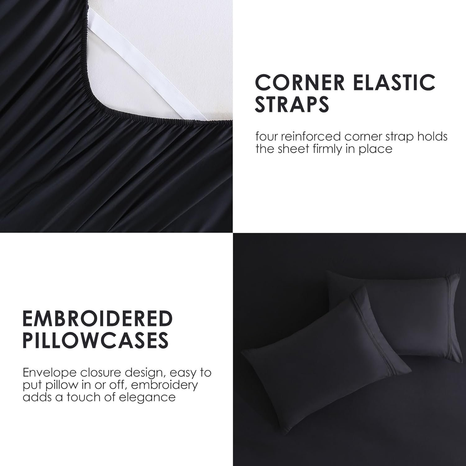 Upgrade your sleeping space with our premium microfiber sheets, featuring 16-inch deep pocket and full elasticization for a perfect fit on any mattress. Our set includes elegant, embroidered pillowcases and is made from OEKO-TEX Standard 100 certified, skin-friendly, breathable and wrinkle resistant