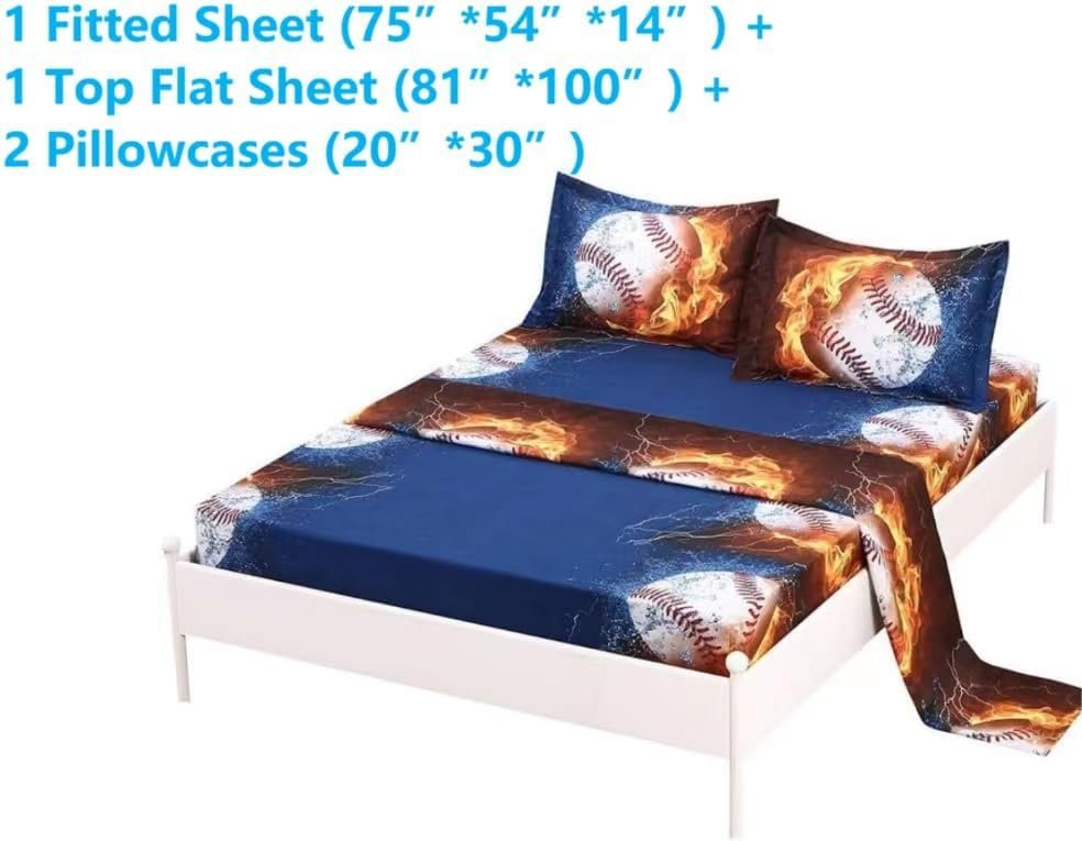 Included: The baseball bedding sheet full set includes 1 fitted sheet (75”* 54”* 14”) + 1 flat sheet (81”* 100”) + 2 pillowcase (20”* 30”). Deep pocket fitted sheet with elastic all around, fits mattresses up to 14″.
