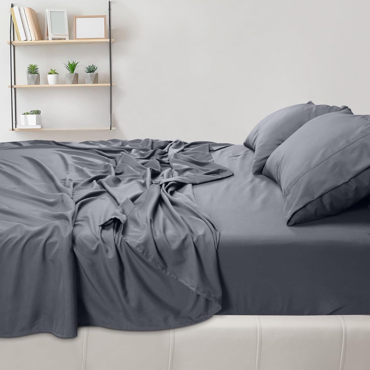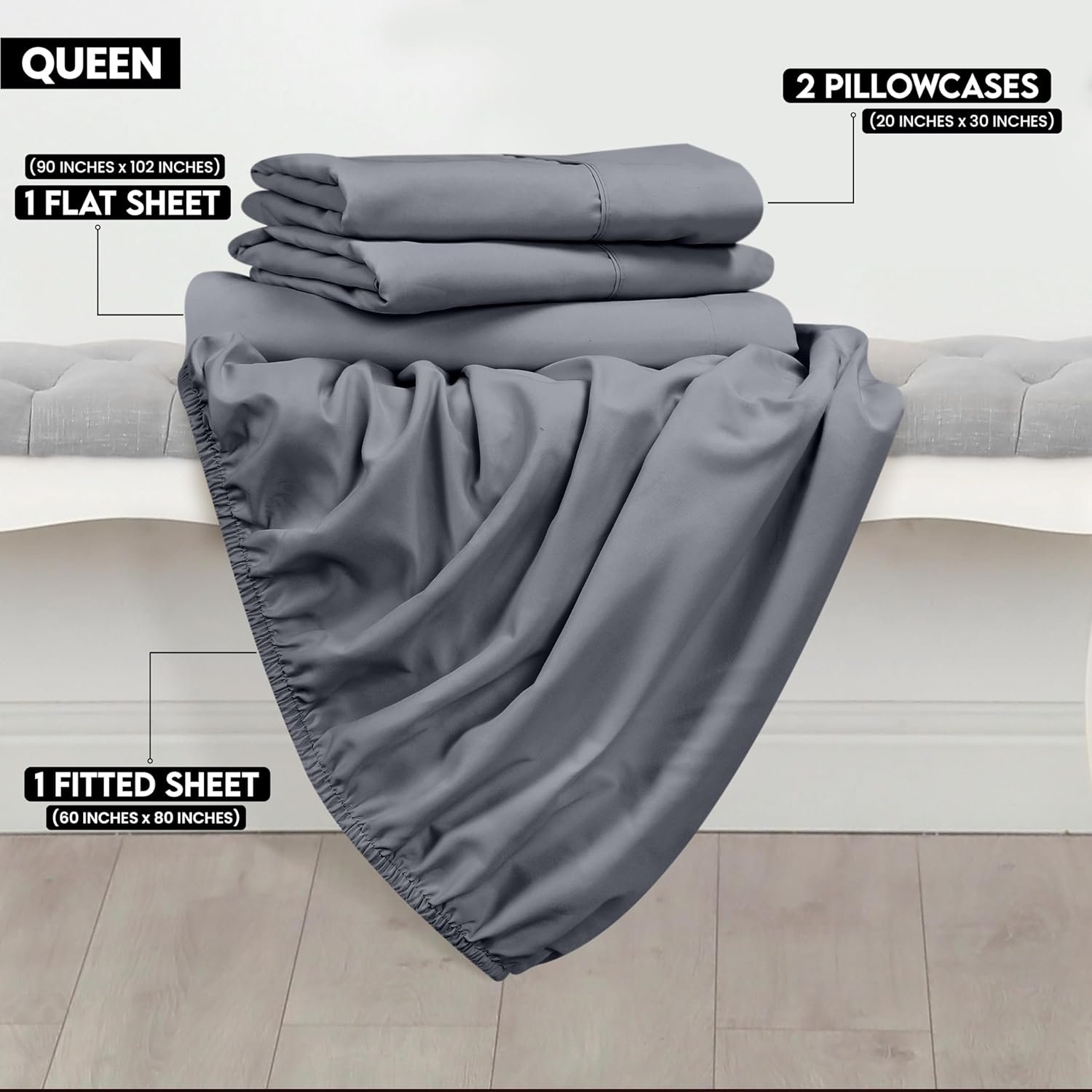 A Complete Bed Sheet Set – The 4-piece queen size sheets set includes 1 flat sheet (90 inches x 102 inches) , 1 fitted sheet (60 inches x 80 inches) with 15 inches deep pocket, and 2 pillowcases (20 inches x 30 inches)