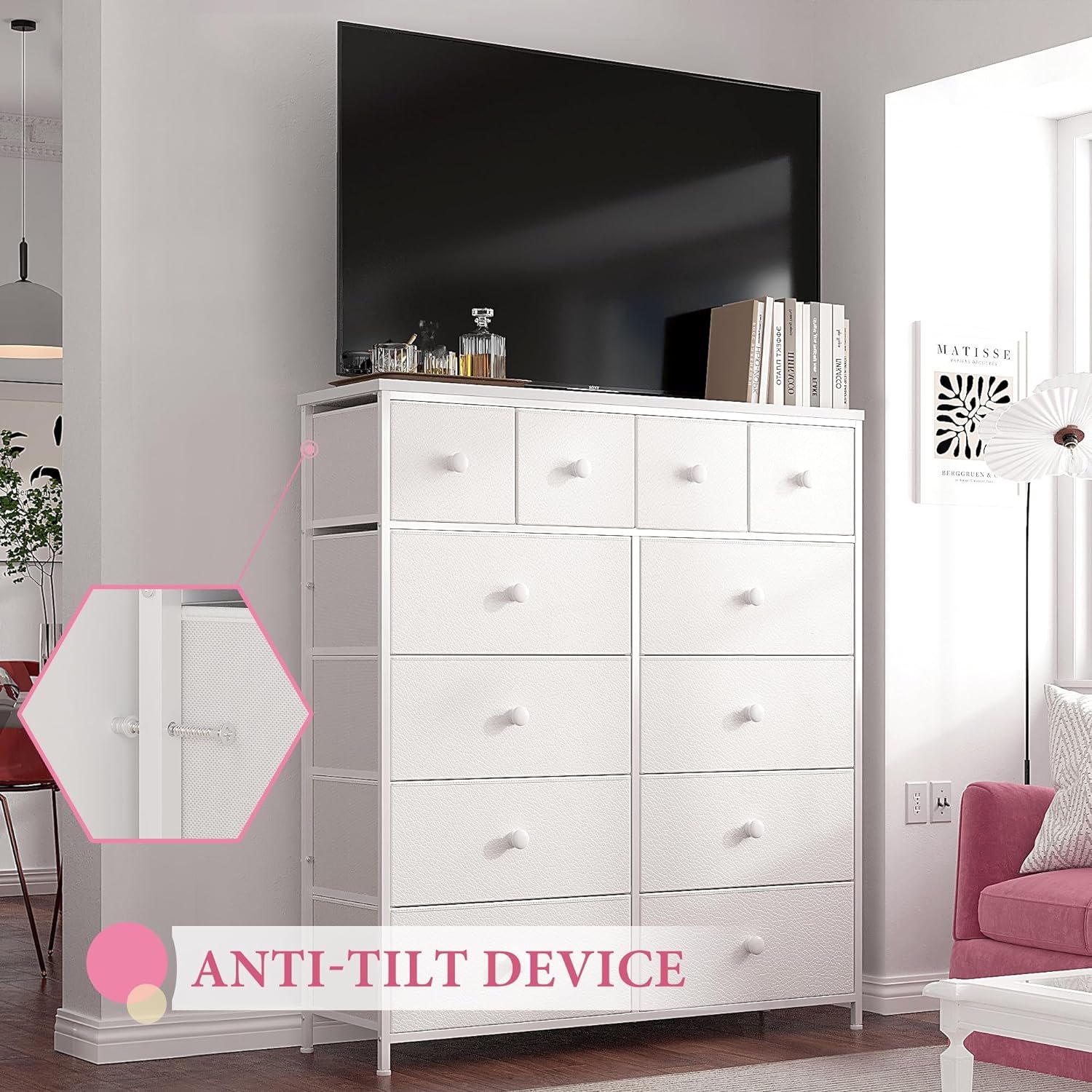 【Sufficient Storage Space】 The white dressers for bedroom has 4 medium and 8 spacious drawers, this white dresser for bedroom offers plenty and classified of storage for lingerie, blankets, underwear, clothes, and more. The wooden top provides a sturdy surface for a 50” TV or displaying items such as vases, lamps, and books.