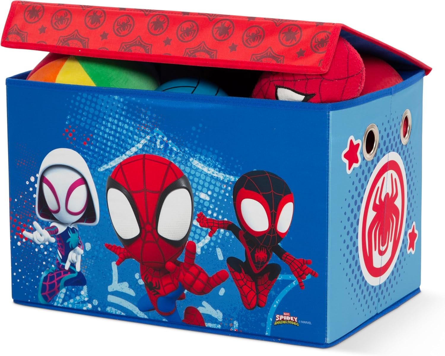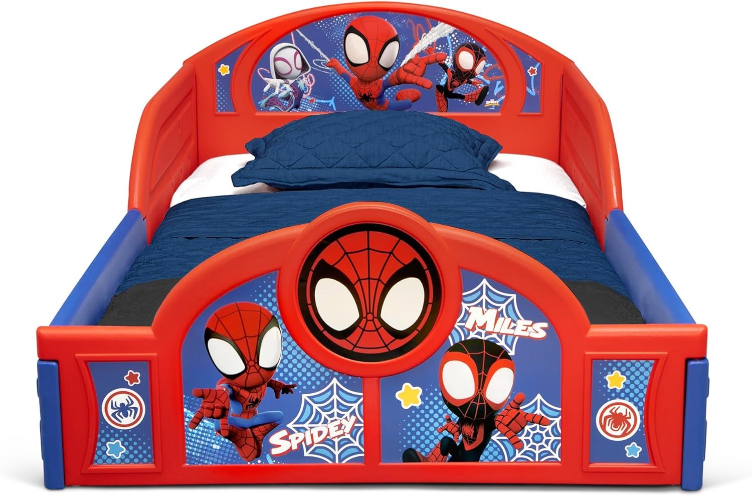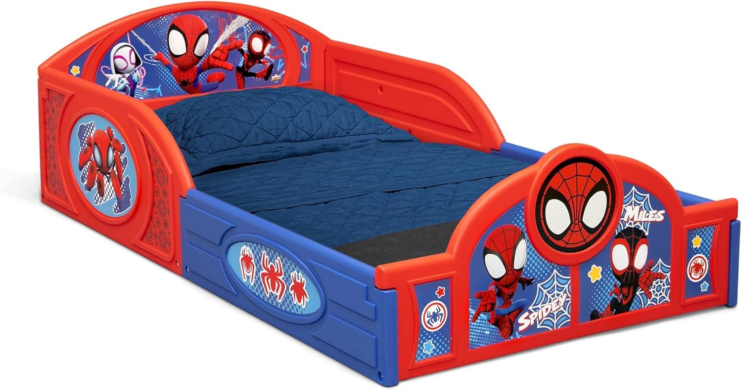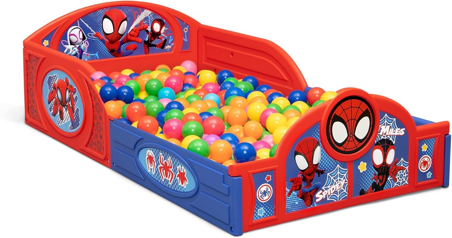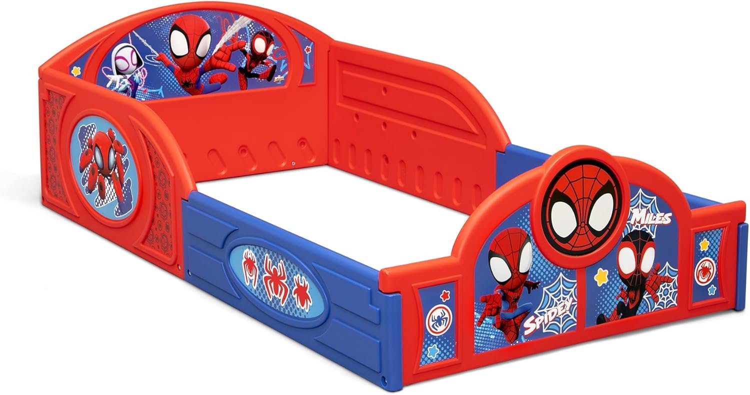 Kids love themed bedroom sets—and this Spidey and His Amazing Friends 4-Piece Toddler Room-in-a-Box Bedroom Set by Delta Children is the best there is! This colorful bedroom set with Spider-Man graphics includes all the pieces you need to create the room of their dreams, like a Sleep and Play Toddler Bed, Table and 1 Chair Set and Fabric Toy Box. The Sleep and Play Toddler Bed features a low mattress height and built-in guardrails that make it the best option for your child’s first big-kid bed, giving them the independence they crave while keeping them safe throughout the night. The bed’s versatile plastic frame can also be used as a play enclosure or a ton of other fun things, like a ball pit (play balls not included). The Table with 1 Chair Set provides the perfect space for your child to do homework, art projects or eat. The Fabric Toy Box features a spacious interior to hold books, blocks, and more, plus it easily folds when not in use. Get the Spidey and His Amazing Friends 4-Piece Toddler Room-in-a-Box Bedroom Set by Delta Children today!