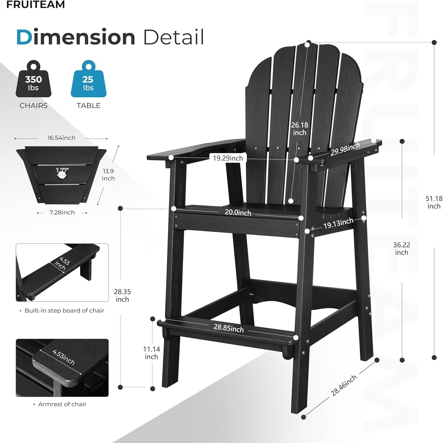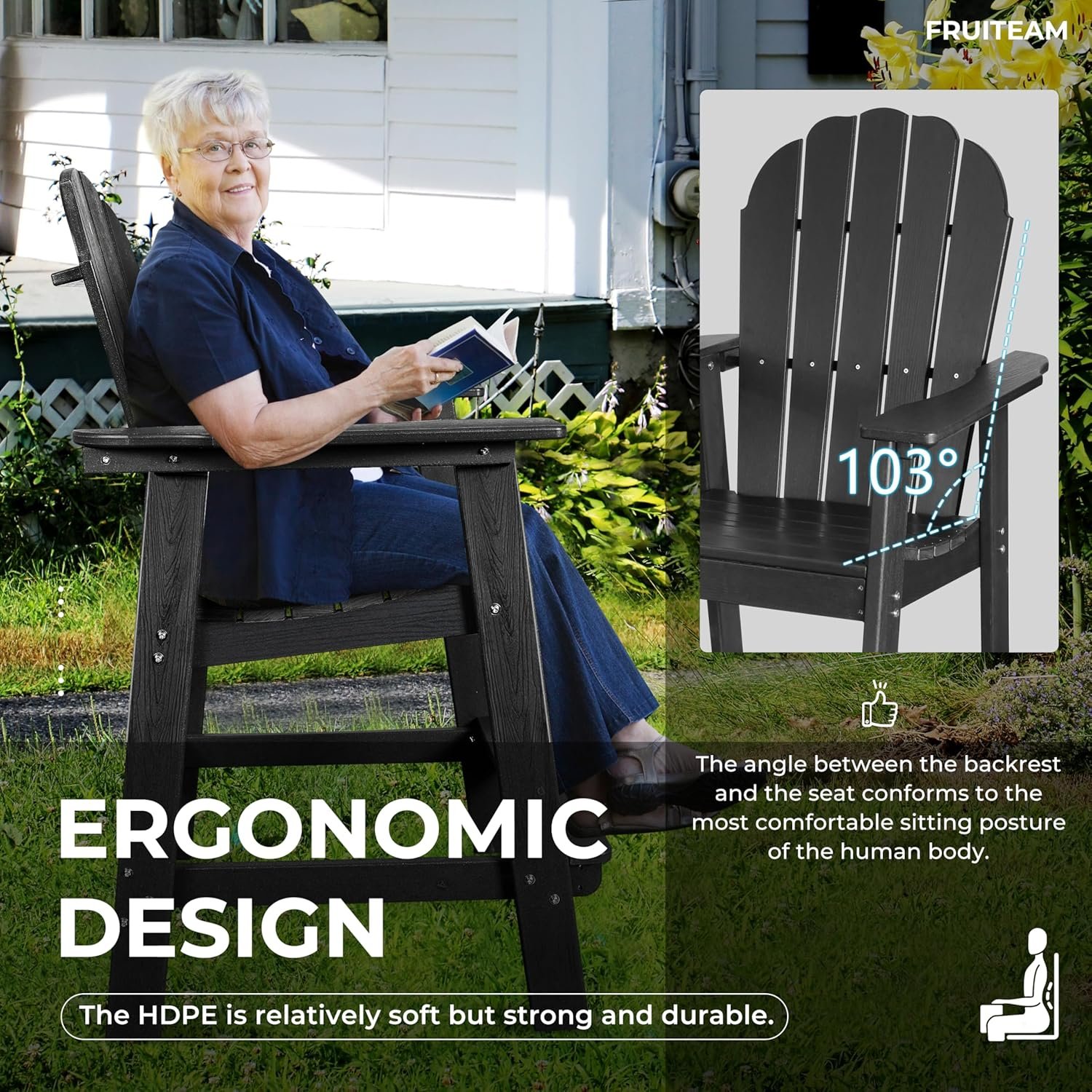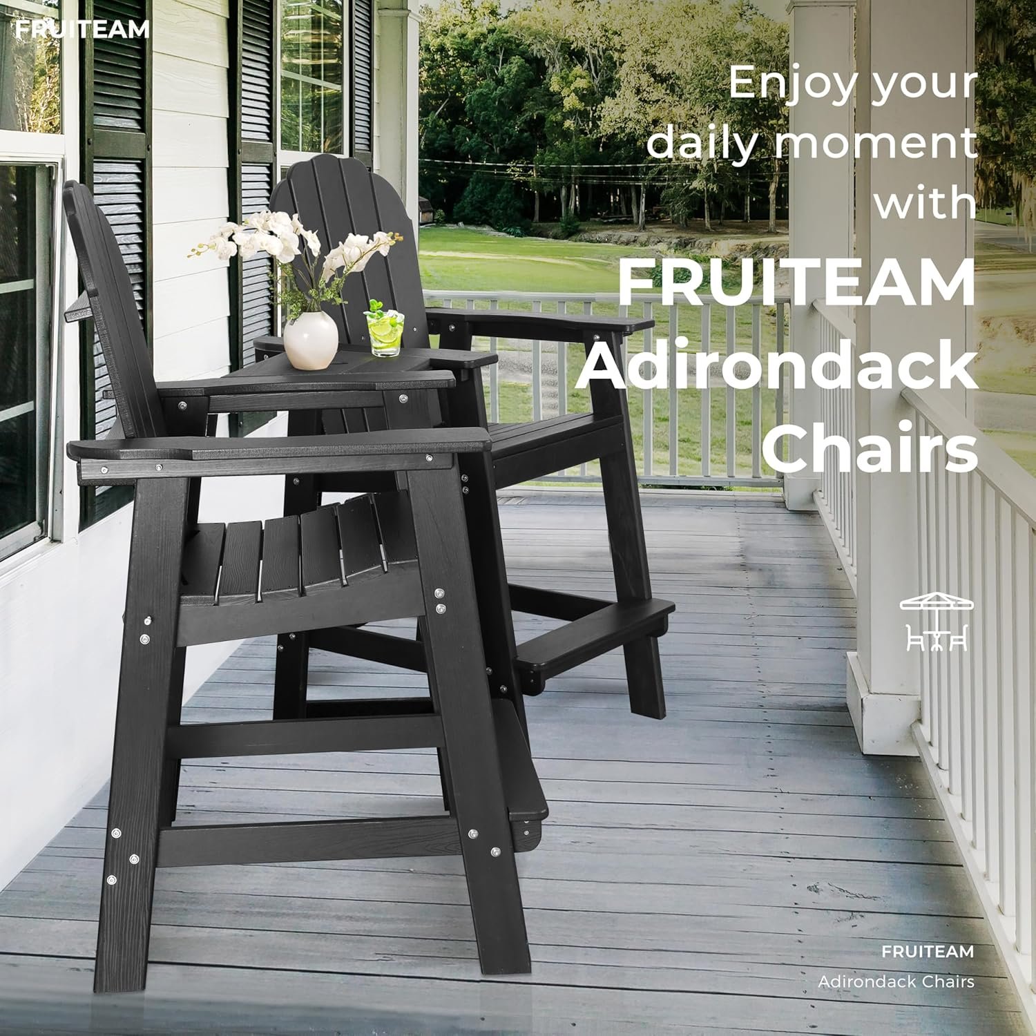 Premium Accessories: Featuring 304 stainless steel components, FRUITEAM bar height Adirondack chairs are rust-resistant and long-lasting, ensuring a secure connection to make it low-maintenace.