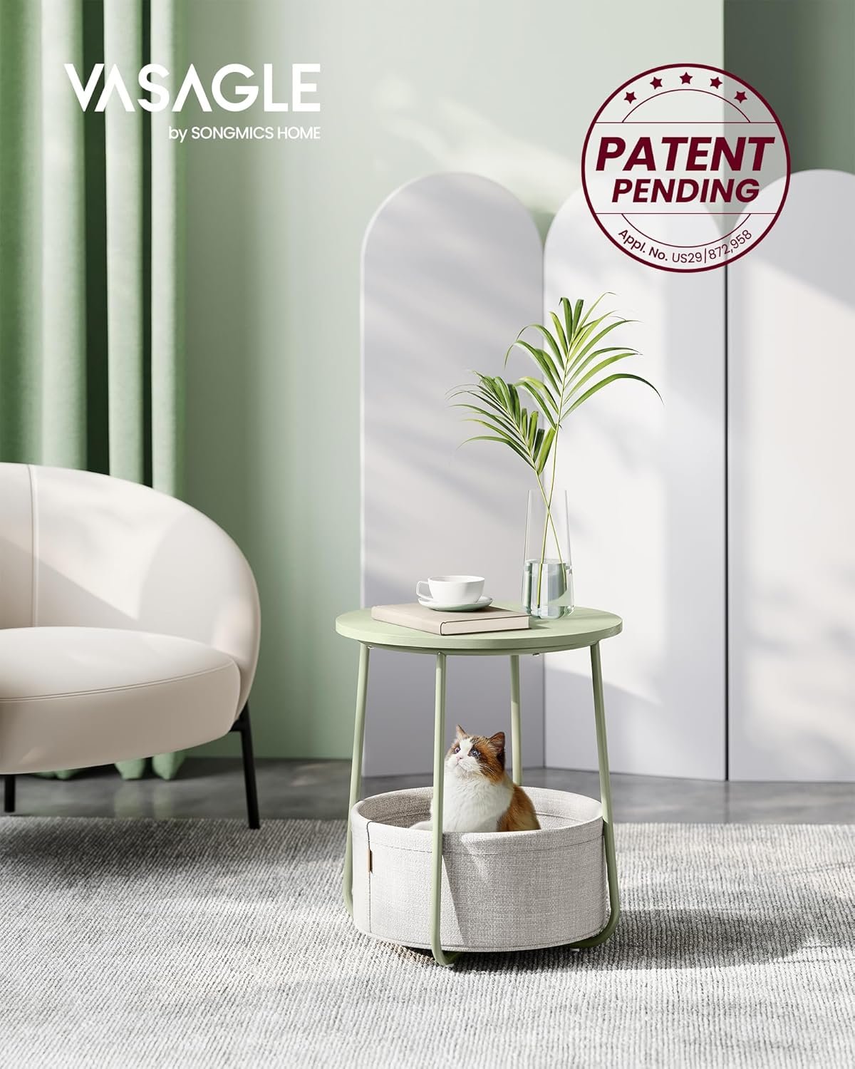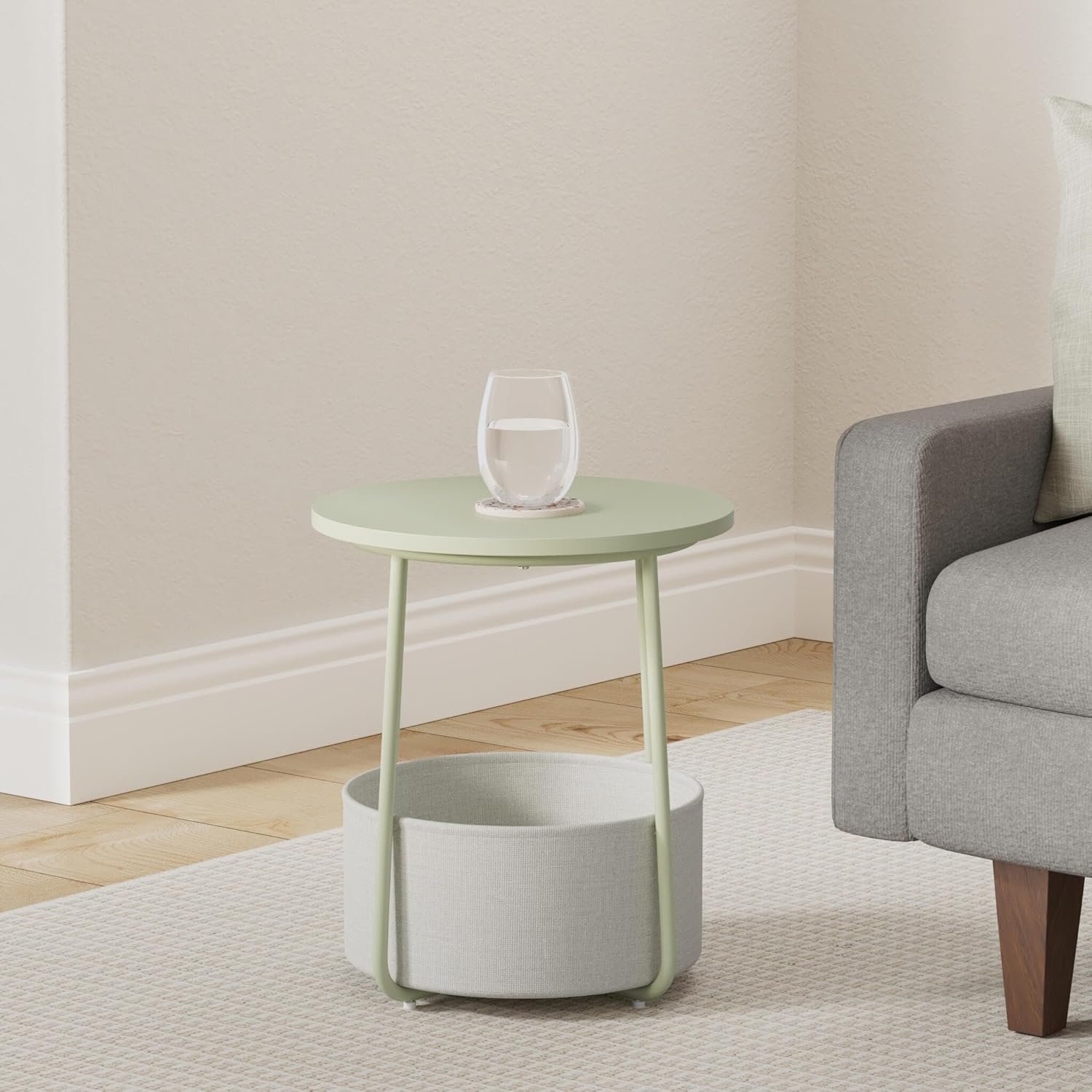 [Modern and Simple] This simple laurel green round coffee table with a cream white basket will add a touch of style to your living room or bedroom and is easy to match with a variety of furniture styles. Design Patent Pending (Appl. No. US29/872,958)