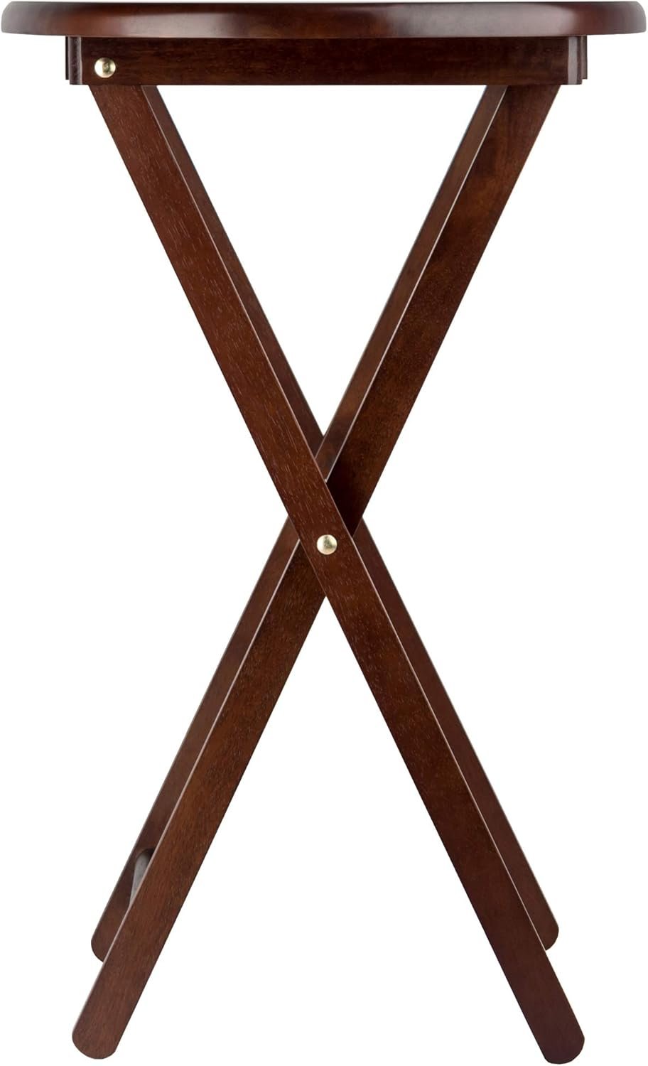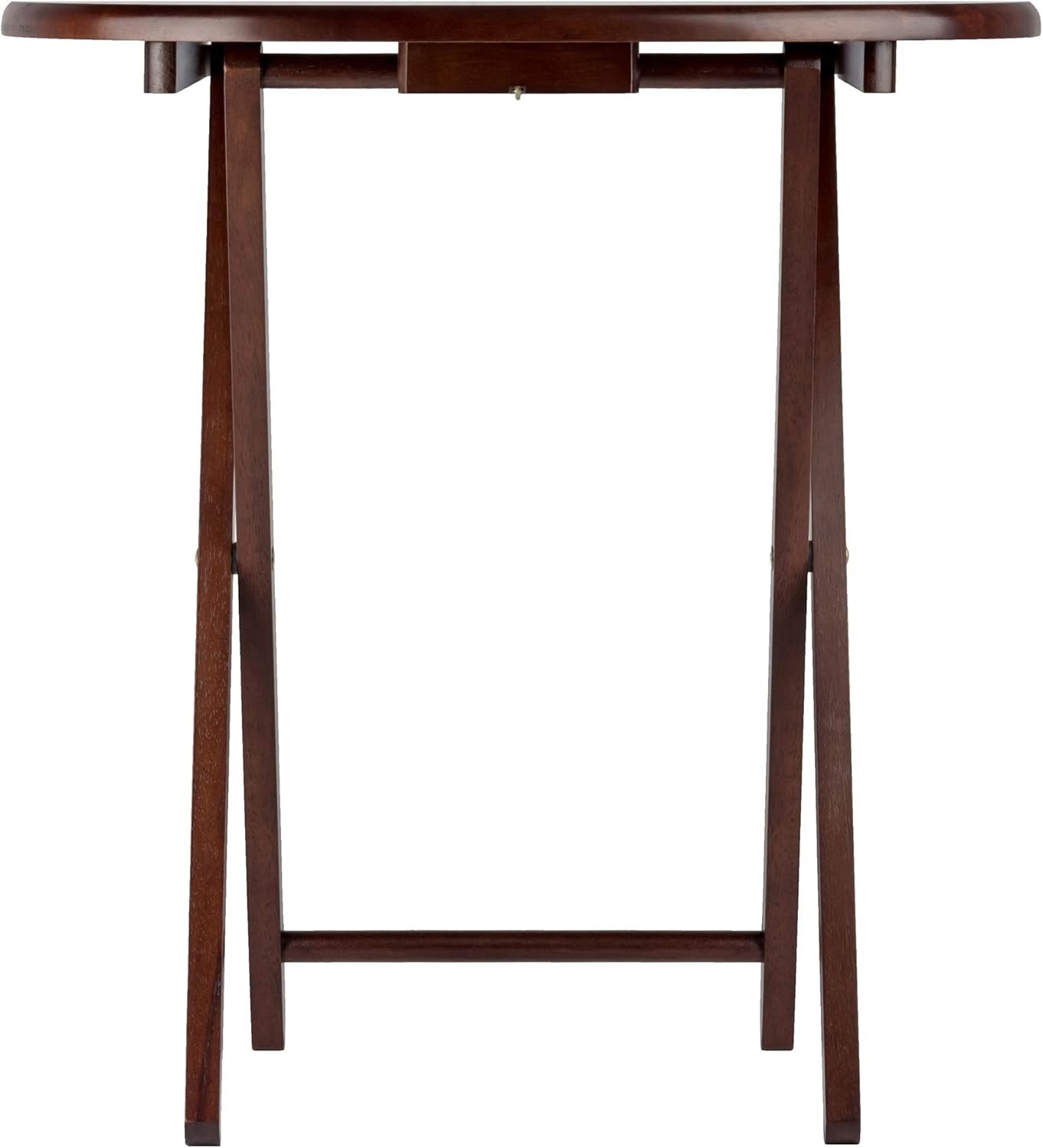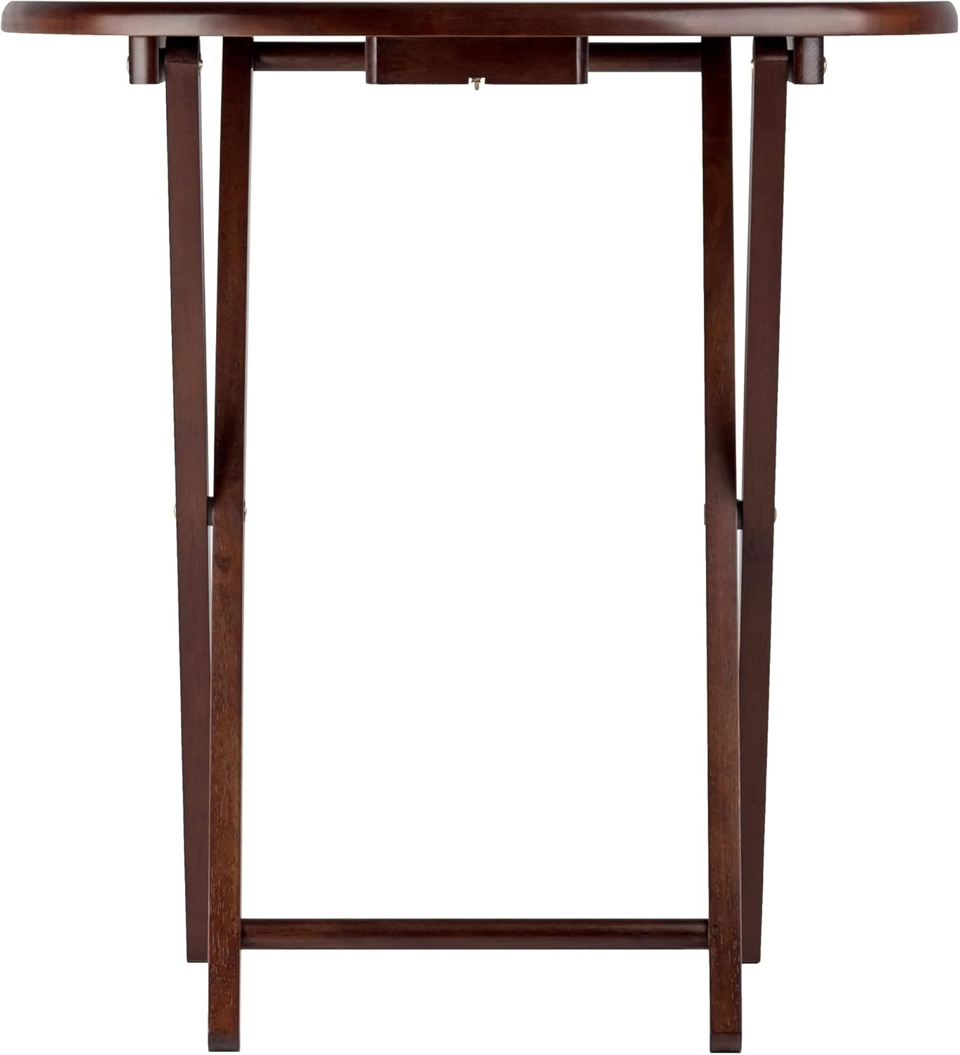 Make entertaining simple and easy with the Winsome Wood Nathan 5-Piece Snack Table Set. This versatile set includes four tables and for convenience a storage rack to store your tables out of the way when not in use. The oval shape of these snack tables makes these distinctive and stylish. Ideal for setting out appetizers at a party, enjoying a meal while relaxing on the sofa, or for working on your laptop. This set of foldable tables open up to X-frame bases which make these table not only look good but also help with stability. Tables easily open up, with a wood stopper on the other end helping the legs stay standing. Great for daily use and compact enough to store in the closet. Constructed of solid wood, the rich cappuccino finish brings out the warmth of the wood grain. Conveniently packed and shipped in 1 box. Tables arrive ready to use and require no assembly. Minimal assembly is required for stand. Replacement part request can be submitted directly to the manufacturer within 60 days from date of purchase. Individual Table Size: 20.7″W x 15.8″D x 25.5″H (open) Individual Table Size (closed): 20.7″W x 2″D x 29″H Dimensions of Stand with tables stored: 23.7″W x 12.9″D x 31.3″H Static Maximum Weight per Table: 25 lbs. Tables come fully assembled Storage Stand requires assembly Ships in 1 box