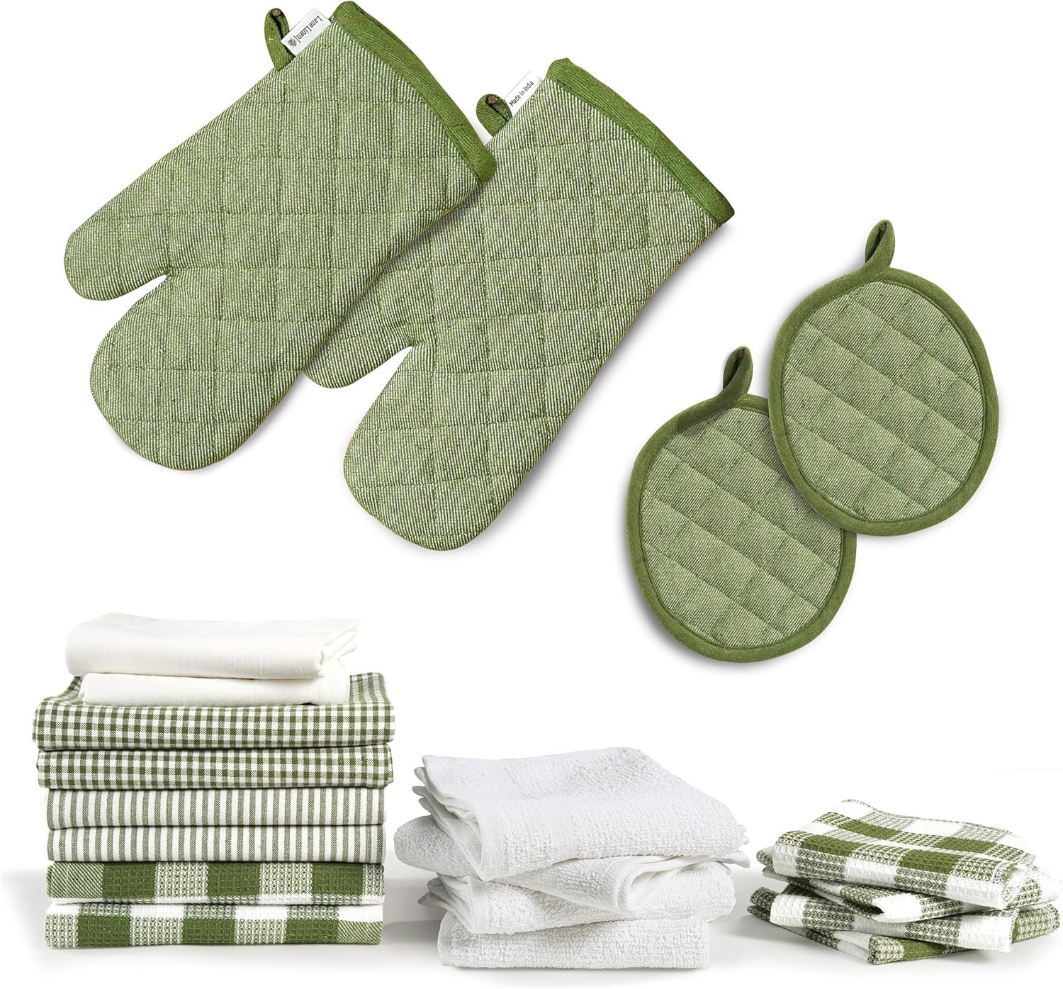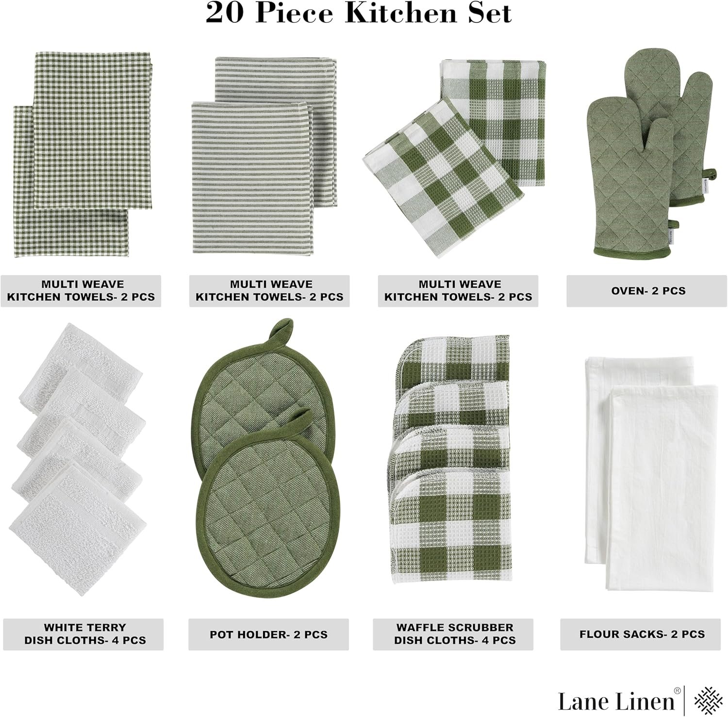 20-Piece Kitchen Marvel: Get more for less with our 20-piece set! Includes 6 cotton kitchen towels (16″x28″), 4 dish wash cloths (12″x12″), 4 dish scrubbers for washing dishes (12”x12”) 2 flour sack dish towels for kitchen (28”x28”), 2 Pot Holders, 2 Oven Mits. All 100% cotton – soft, durable, and ready to tackle any kitchen task!