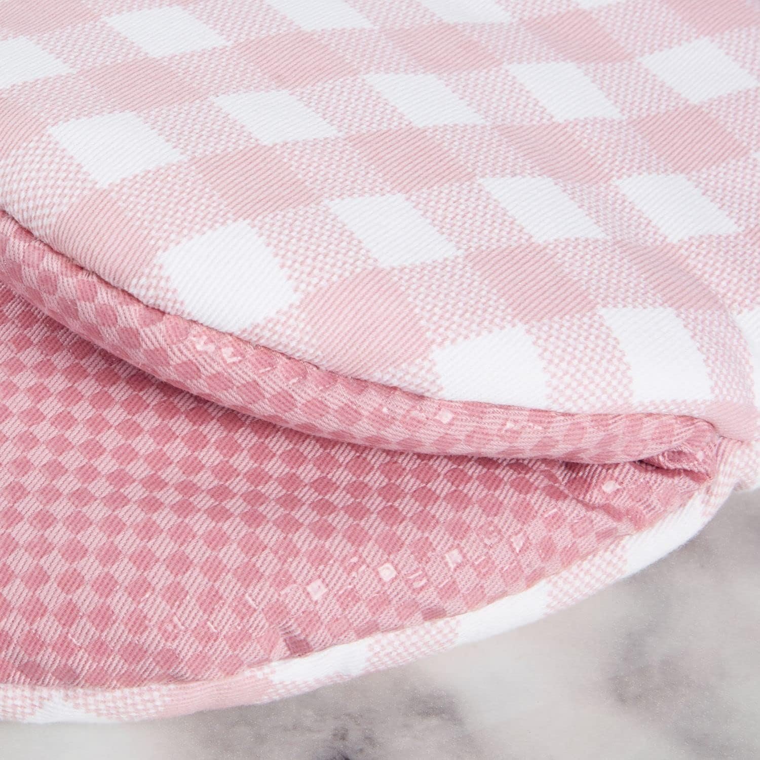 Protect your hands from hot pots and pans with the KitchenAid Gingham 2-Piece Mini Oven Mitt Set in Dried Rose. Each mitt measures 5.5 inches wide by 8 inches long for easy on-and-off use and features a classic checkered print pattern. Made of cotton fabric with polyester lining that offers comfort and insulation, these mitts are heat resistant with clear printed silicone to ensure a more secure grip. This set is machine washable for easy care.
