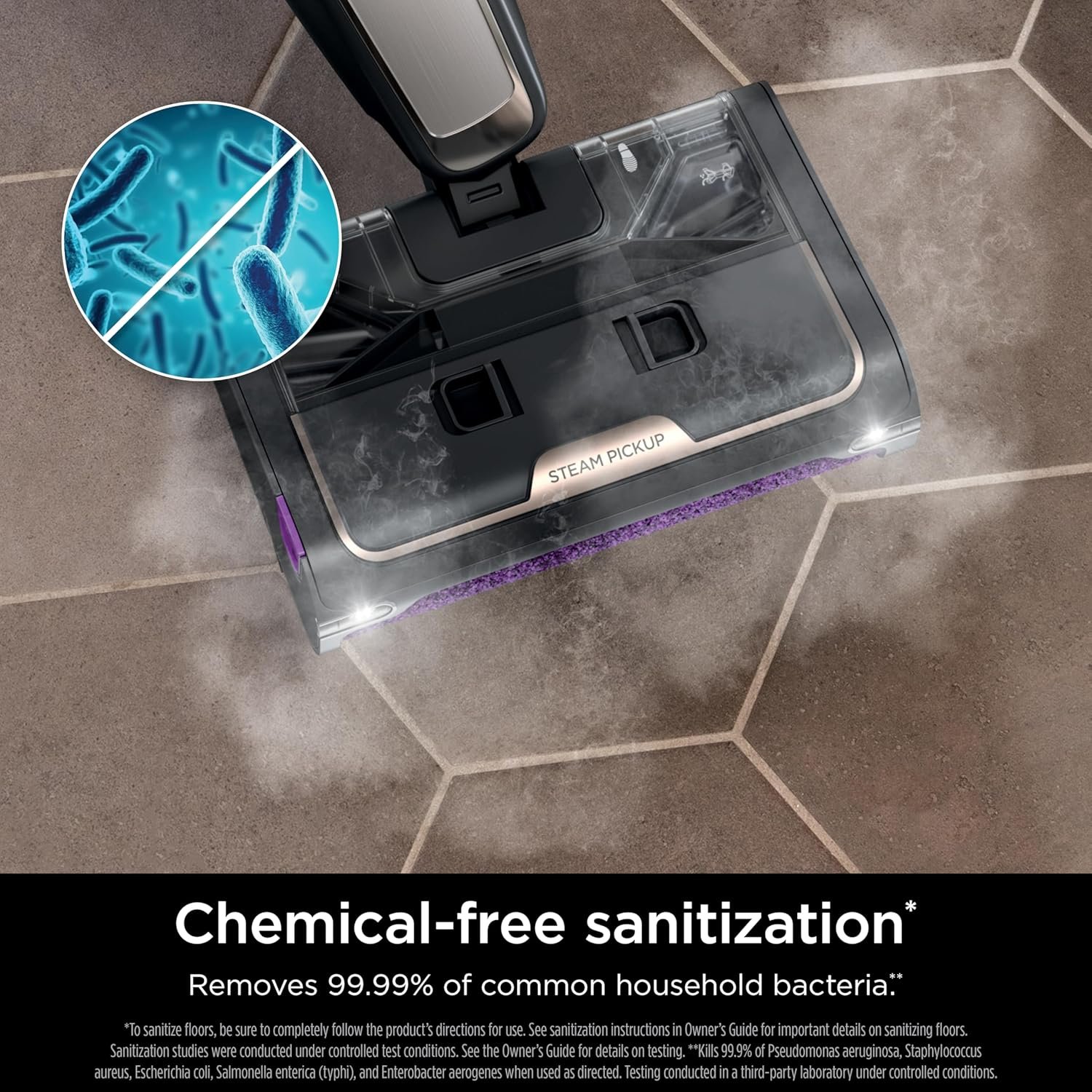 CHEMICAL-FREE SANITIZATION: Eliminates up to 99.9% of common household bacteria* with the sanitizing power of steam. No harsh chemicals – just add water.