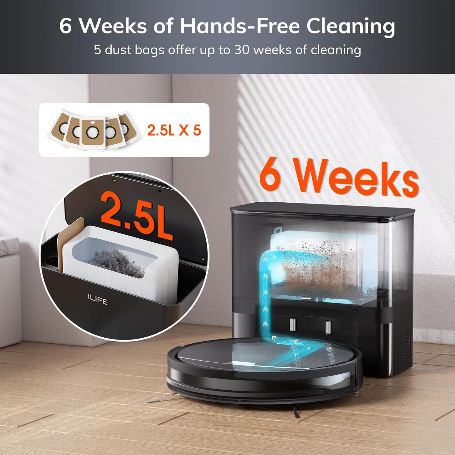 Up to 30 Weeks of Hands-Free Cleaning: The ILIFE V9 Pro self emptying robot vacuum cleaner is equipped with a self-empty station and five 2.5L capacity dust bags, each bag can handle dust and debris for up to 6 weeks, 5 bags mean it can hold up to 30 weeks (210 days) of cleaning. The powerful 20,000Pa suction vacuum station effortlessly empties the collected dirt and debris into the dust bag, sparing you the trouble to empty the trash every day