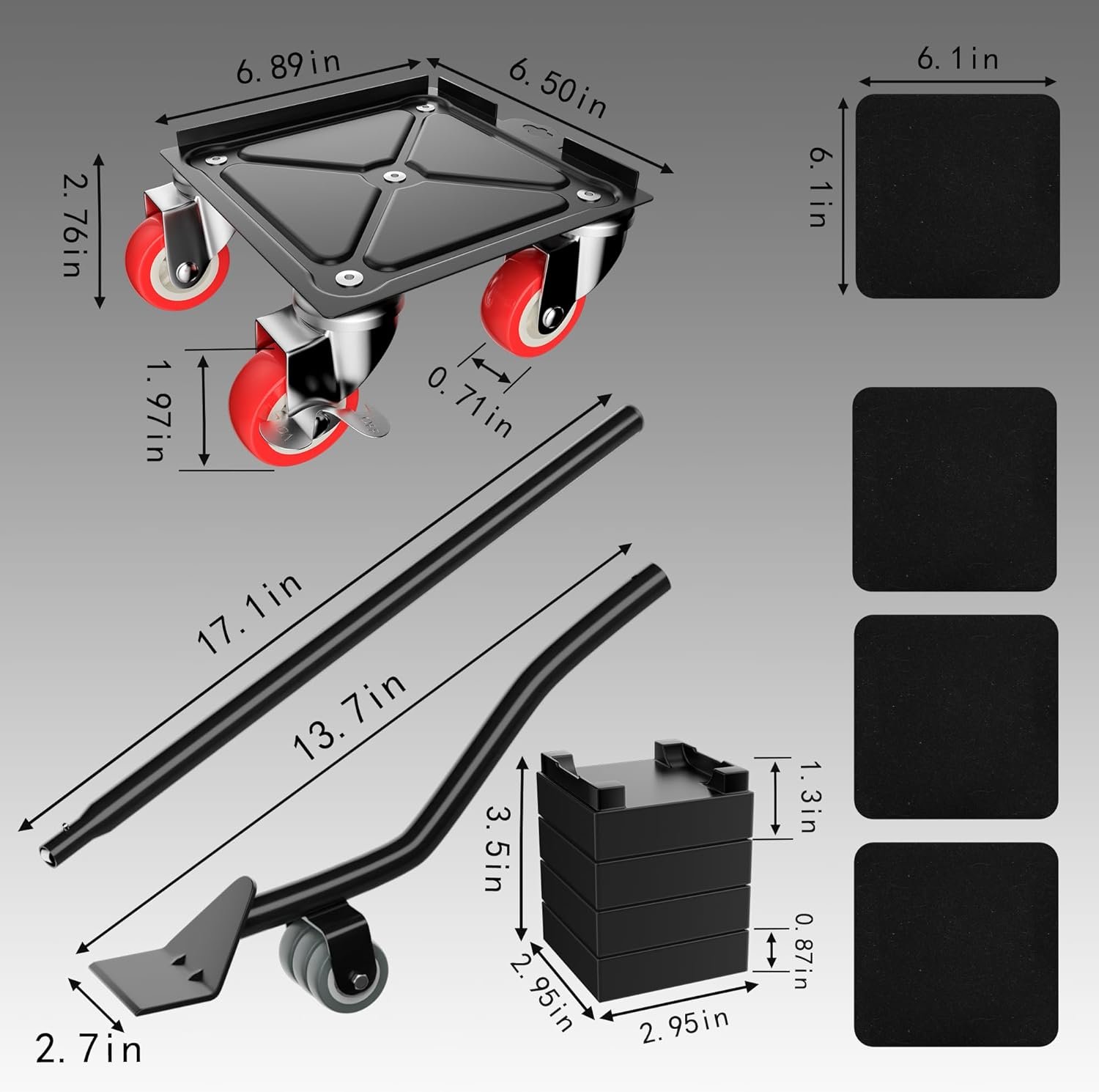 [SURPRISE GIFT PACKAGE]:Upgraded large panel furniture dolly set, including four 6.5 x 6.5 in moving dolly,1 x pry bar,4 x heightening spacers,4 x flannel non-slip mats,2 x rubber anti-slip mats,1 x pair of safety gloves,1 drawstring storage bag.