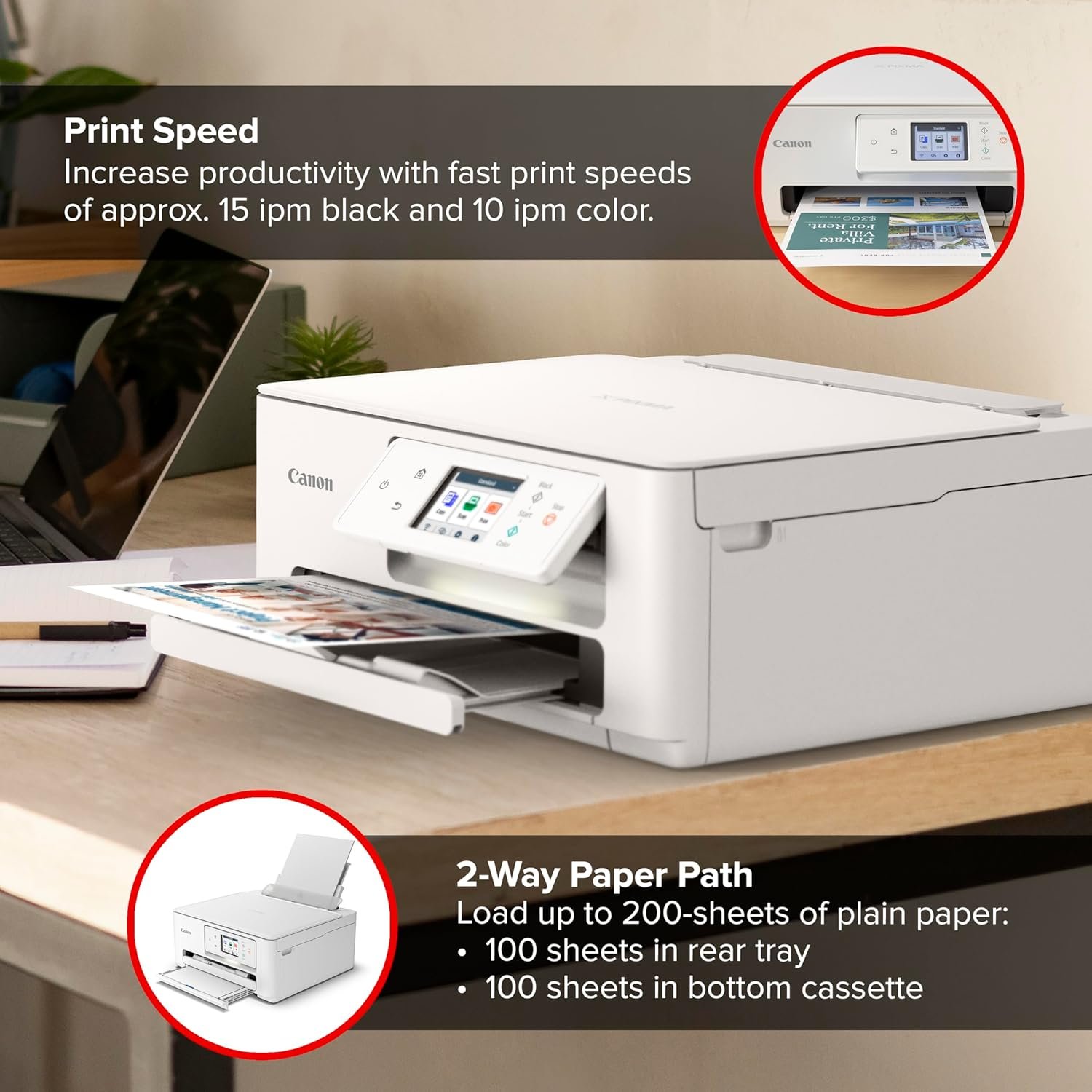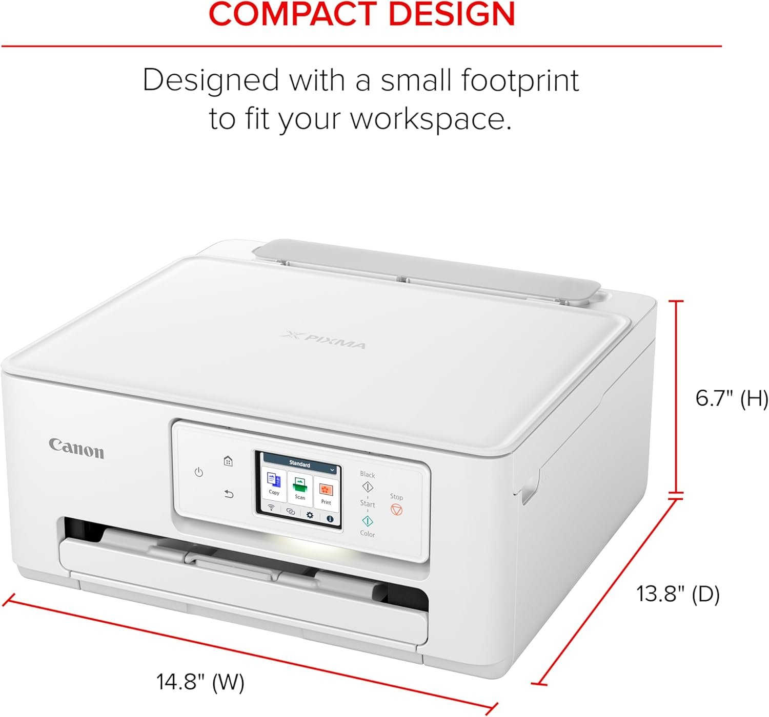 Designed for home use, the Canon PIXMA TS7720 All-in-One inkjet printer delivers high-quality printing and outstanding wireless connectivity in a compact size. The PIXMA TS7720 is easy to set up and maintain and offers great media versatility to print on a variety of media types and sizes, including photo paper, envelopes, borderless photos, banners and more. Use Poster Artist Online to create professional-posters, banners and signage. Print both documents and photos on a variety of paper types using a hybrid ink system with pigment black for sharp black text and dye-based colors for vivid photos up to 8.5” x 11”. Produce crisp, colorful documents and photos quickly and cost-effectively with fast print speeds and high-quality 2 cartridge FINE Hybrid ink system. Keep printing with a plain paper capacity of up to 100 sheets in the standard cassette, and 100 sheets in the rear tray. Easily connect and print through high-speed USB or wirelessly from computers or mobile devices. This comes with a 1-year limited warranty and is backed by Canon’s Service and Support network.