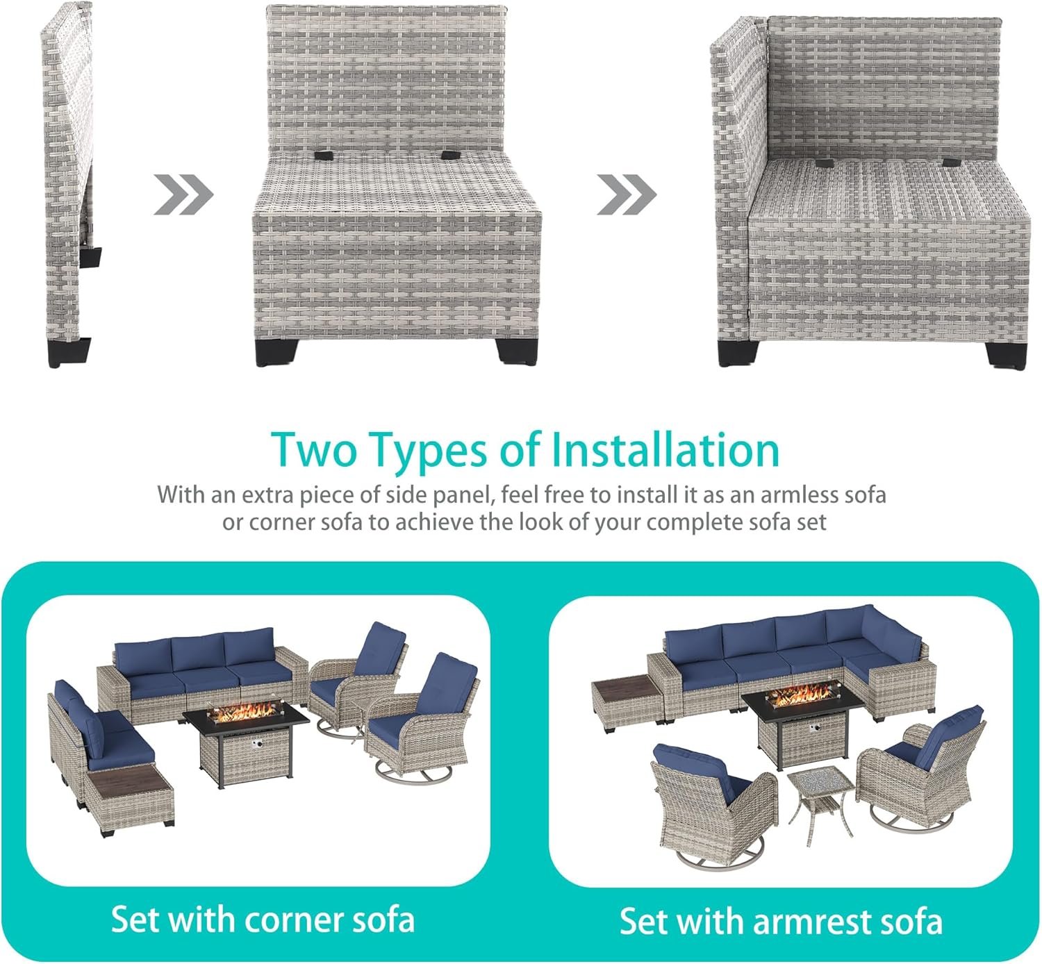 Includes: The 10-piece set includes 2 armrest sofas, 2 single sofas, 1 corner sofa, 1 coffee table, two swivel chairs, 1 side table and 1 fire pit table, providing ample seating for entertaining or relaxing. The ergonomic design and thicken cushions offer superior comfort. Designed for year-round use, this rattan furniture set features UV-resistant and waterproof materials, ensuring it withstands sun, rain, and humidity