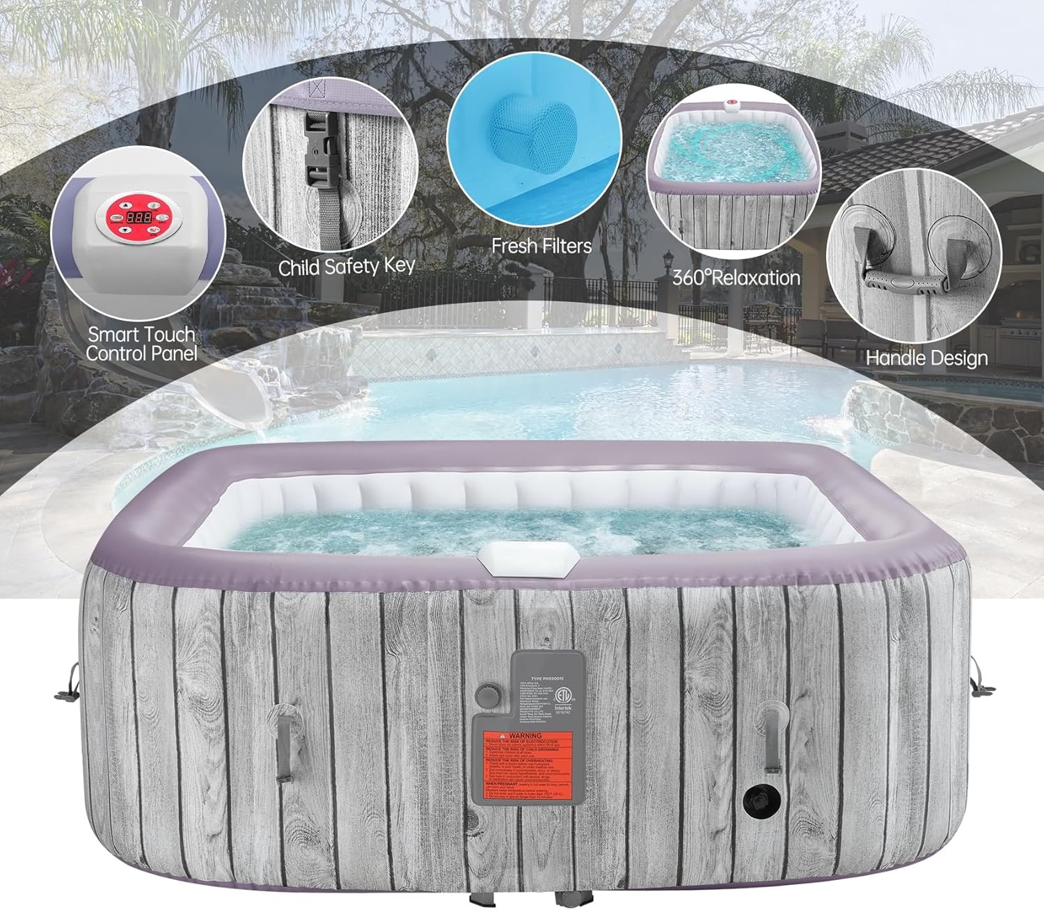 Spacious and Comfortable:Measuring 73”x73” and 25 inches deep, this enlarged hot tub comfortably fits 4 to 6 people. Ideal for family gatherings or social events, it offers ample space for relaxation.