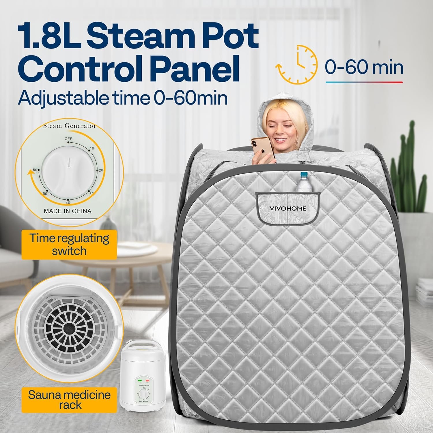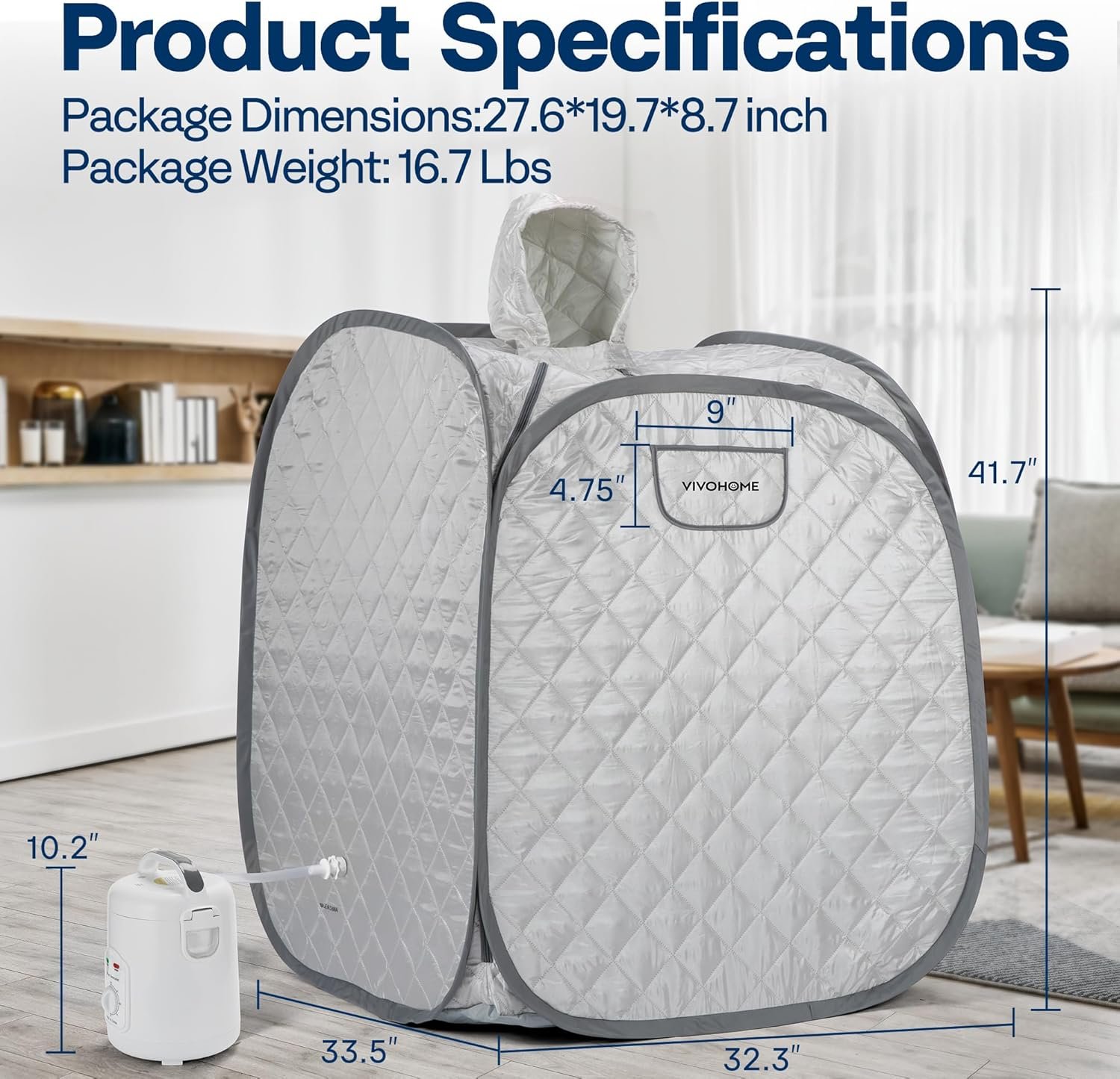Warning Keep the sauna away from other stuff when using it for the sake of safety Note Affected by the ambient temperature, the actual temperature in the sauna steam room may be different in winter and summer Attention Do not put herbs directly in the steamer and boil them. It’s appropariate to put herbs bag on the rack Color Silver Gray Steamer White PP Body and 304 Stainless Steel Inner Container Sauna Spa Polyester, PVC Frame Stainless Steel Wire Dimensions 33.5” x 32.3” x 41.7” Voltage 120V/60Hz Power 800W Time setting 0-60 minutes Package Includes 1 X Sauna Room; 1 X 1.8L Steam Pot; 1 X Collapsible Chair; 1 X Medicine Rack; 1 X Foot Massage Roller; 1 X Absorbent Pad; 1 X Hose; 1 X Carry Bag