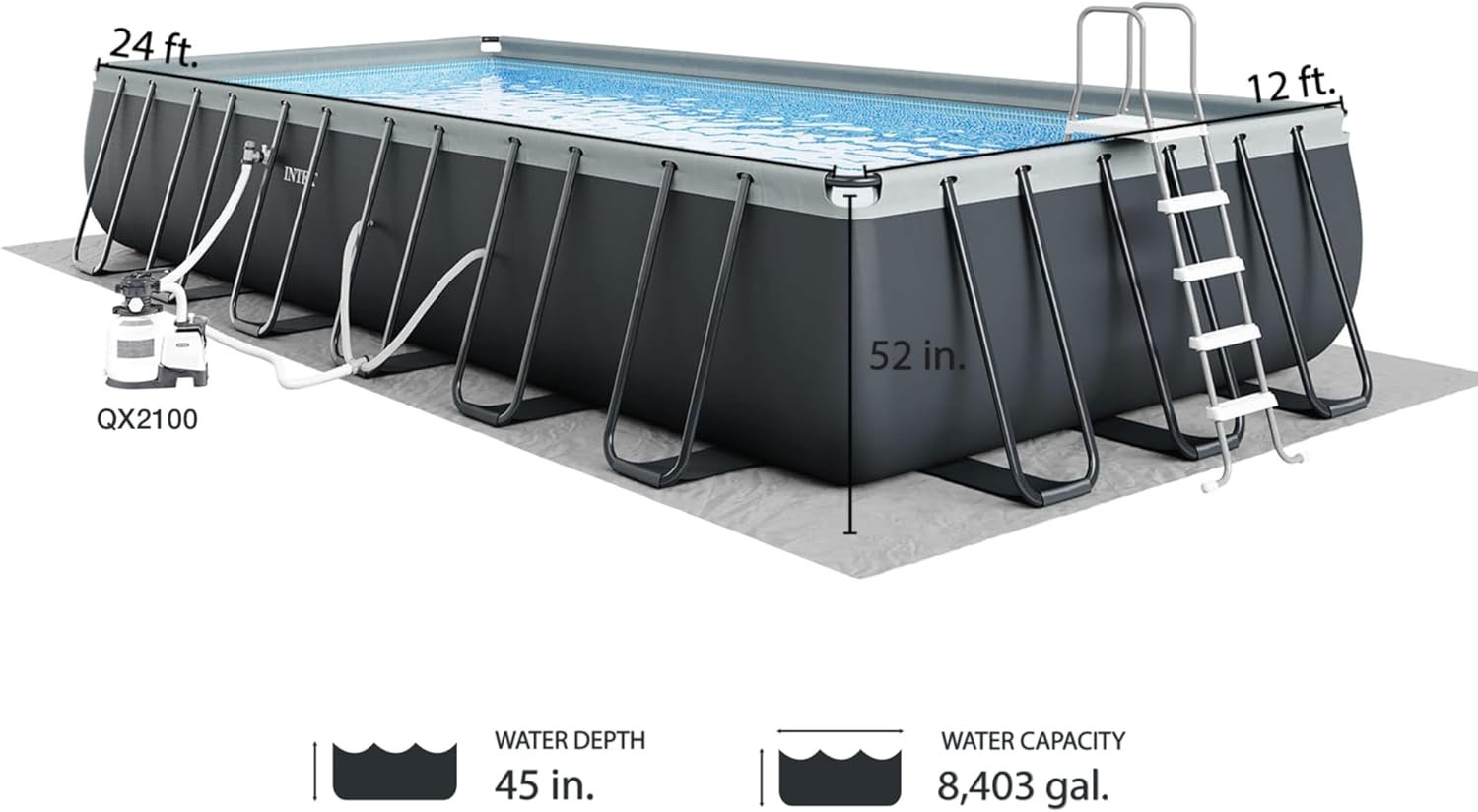 RELAXING SWIMMING POOL: Swim your summer days away in the Intex Ultra Frame Rectangular Above Ground Outdoor Swimming Pool with a gray outer liner and blue tile-print inner liner for a classic look