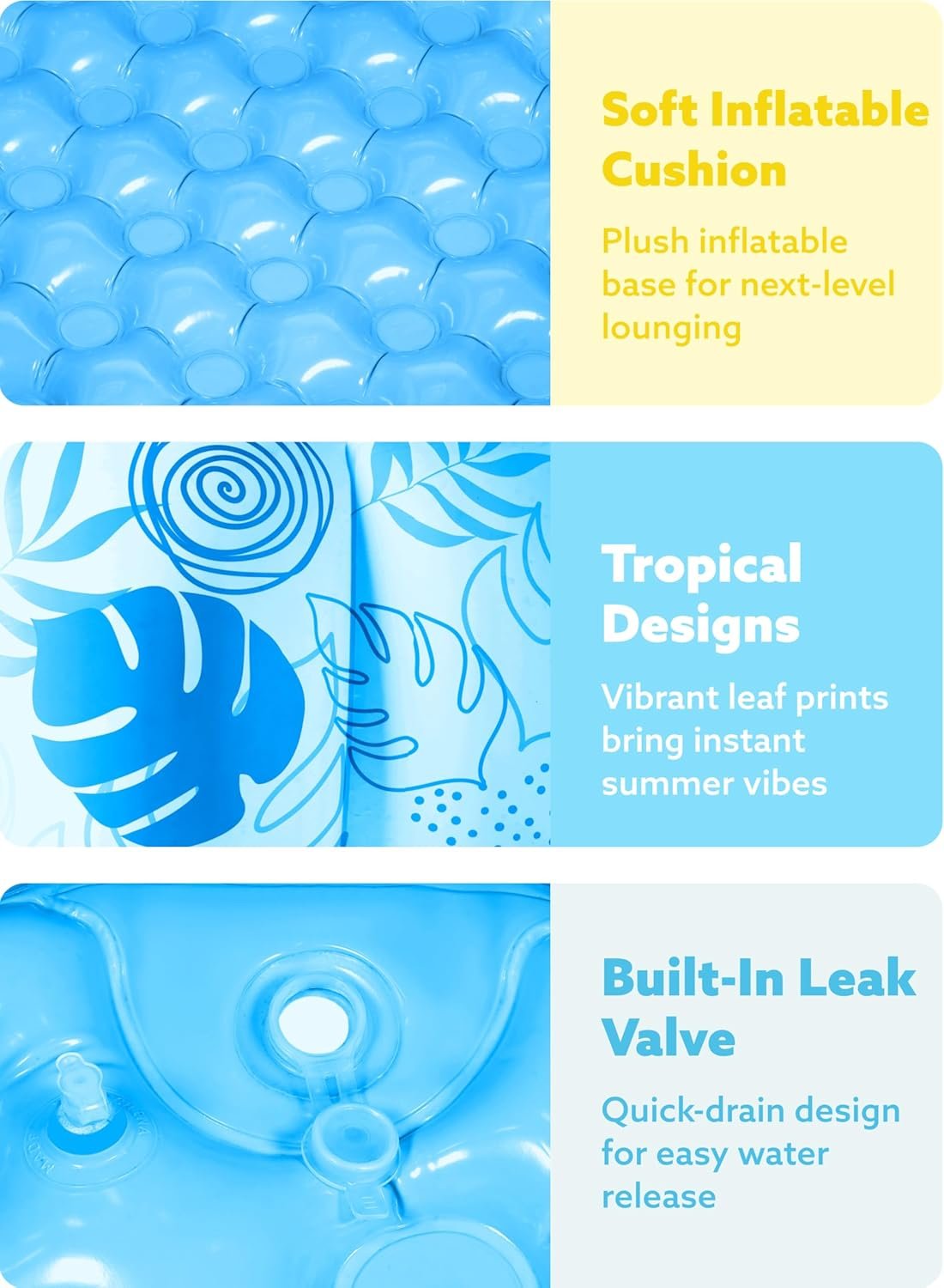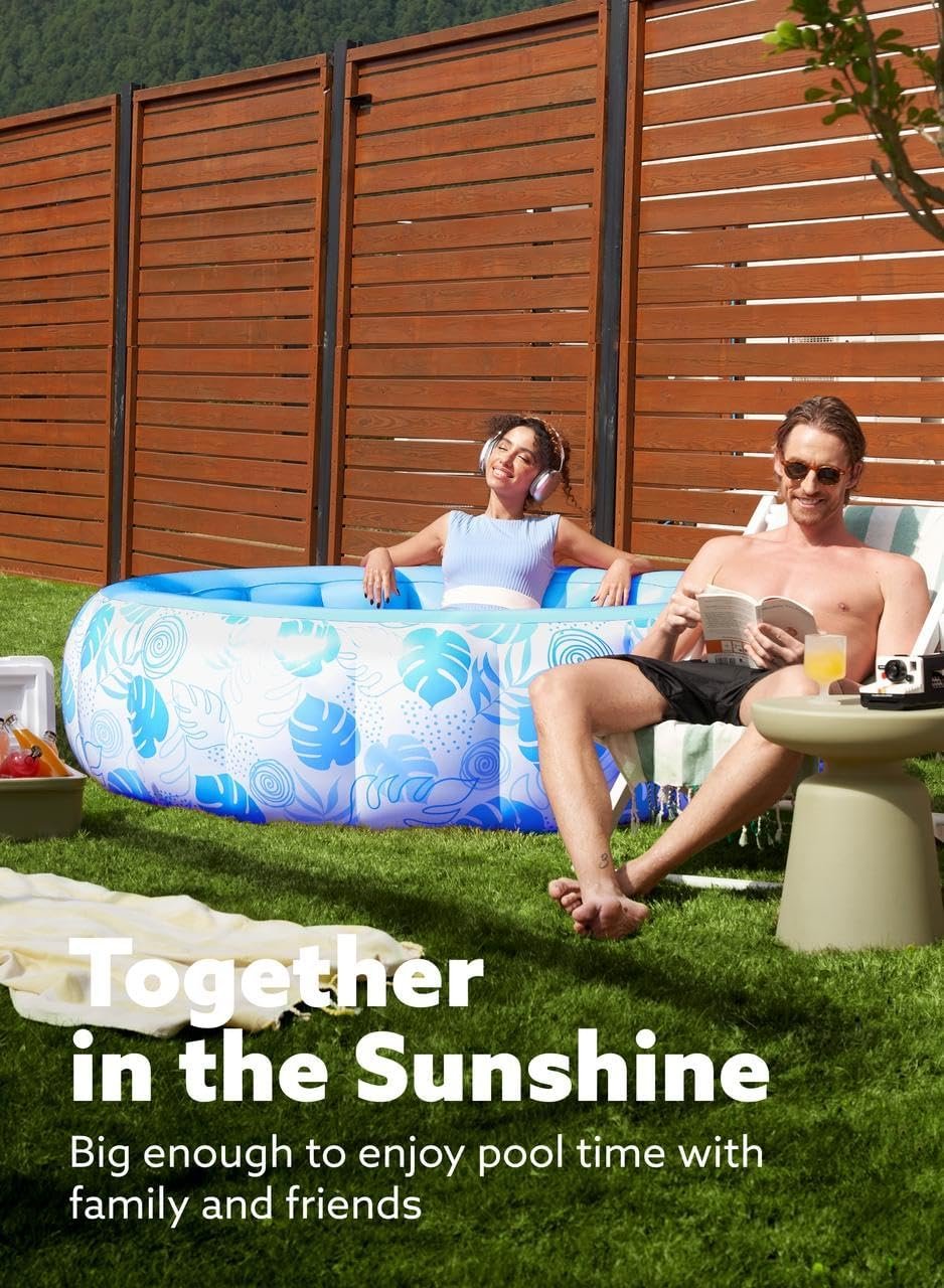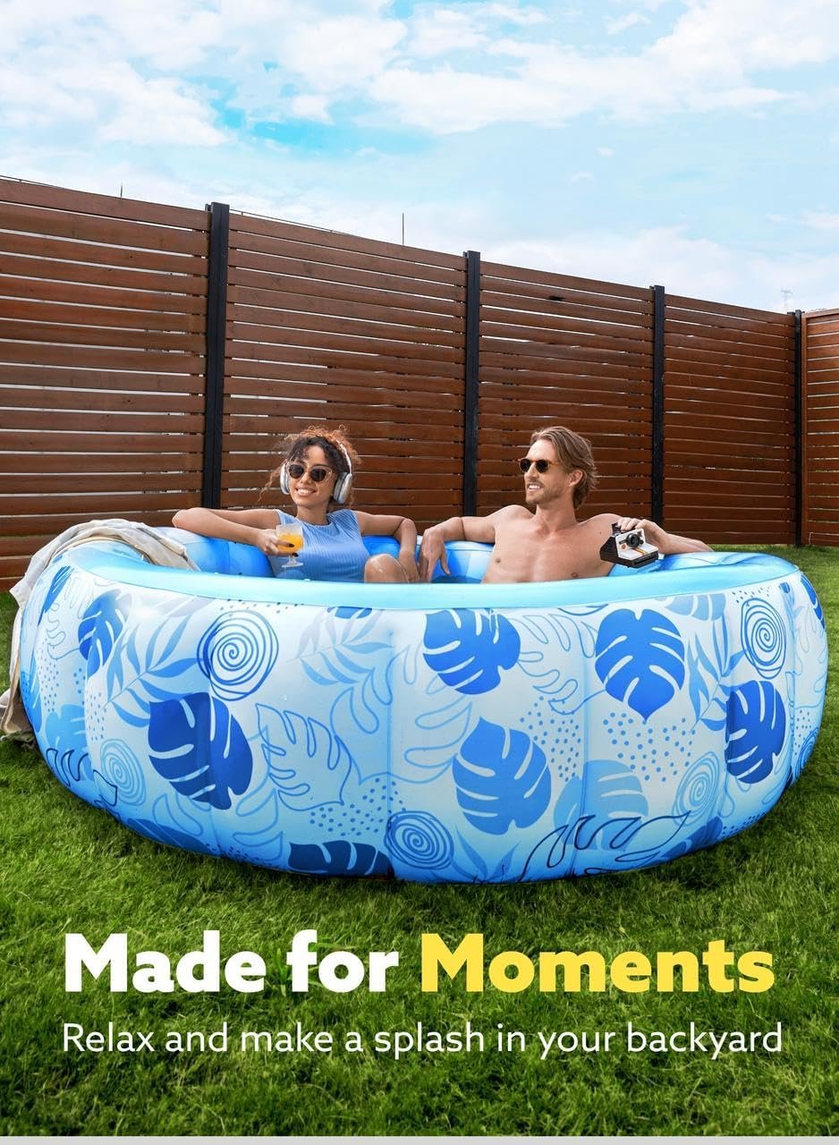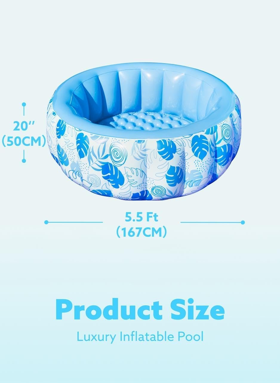 SPACIOUS DESIGN: This 5.5ft x 20-inch luxury inflatable pool comfortably fits 2-3 adults, making it perfect for family relaxation. COMFORTABLE BACKREST: The pool features a strong inflatable wall that provides a sturdy backrest for added comfort while lounging. FEATURED WITH WATER DRAIN PLUG FOR EASY DRAINING WATER: Easily empty the pool when done using the built-in water drain plug, making cleanup fast and simple. DURABLE & SAFE MATERIAL: Made from heavy-duty PVC, this pool is puncture-resistant and built to last, ensuring safe fun for everyone. ELEGANT BLUE TROPICAL DESIGN: The stylish blue tropical leaves pattern adds a touch of luxury to your backyard, perfect for summer vibes and outdoor gatherings. EASY TO SET UP: Simply inflate the pool and fill it with water – no complicated assembly required, so you can start enjoying it right away.