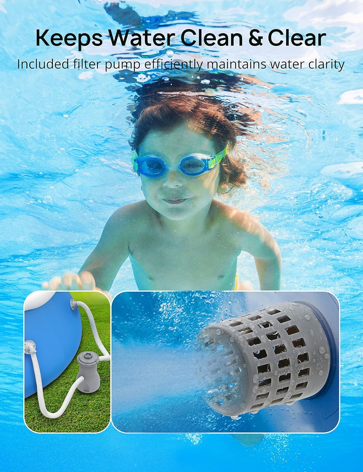 【Great Accessories】The above ground pool comes with filter pump, ground cloth and pool cover. The filter pump can pump up to 800 gal of water per hour, a pool cover can keep out dirt and debris, and a ground cloth to provide protection against abrasions.