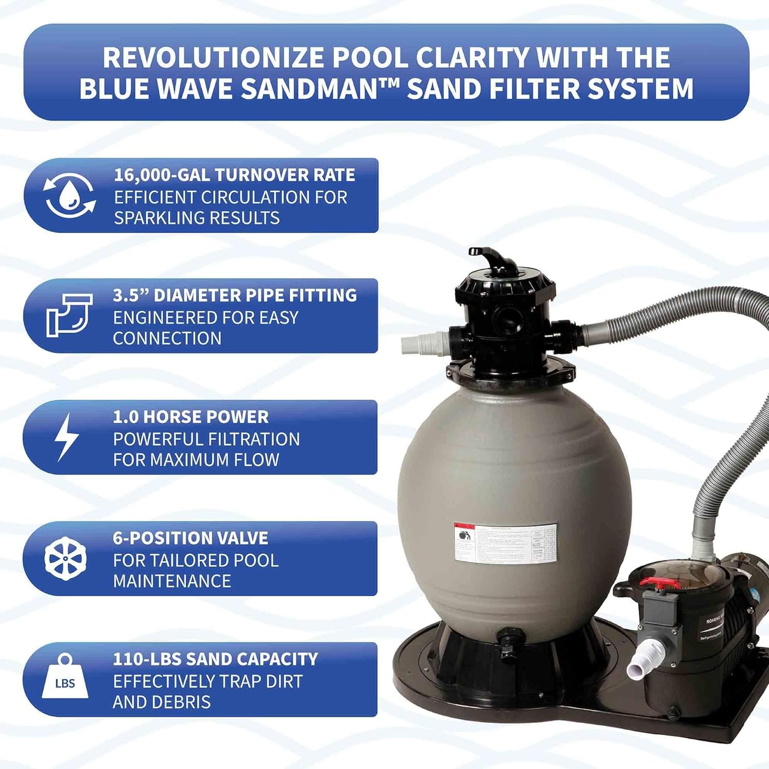 CRYSTAL CLEAR AND COST EFFICIENT – Circulating water at 3,720 GPH, the Sandman Filtration System provides exceptional water clarity and energy efficiency. The system balances filtration needs with energy savings, ensuring pristine swimming conditions.