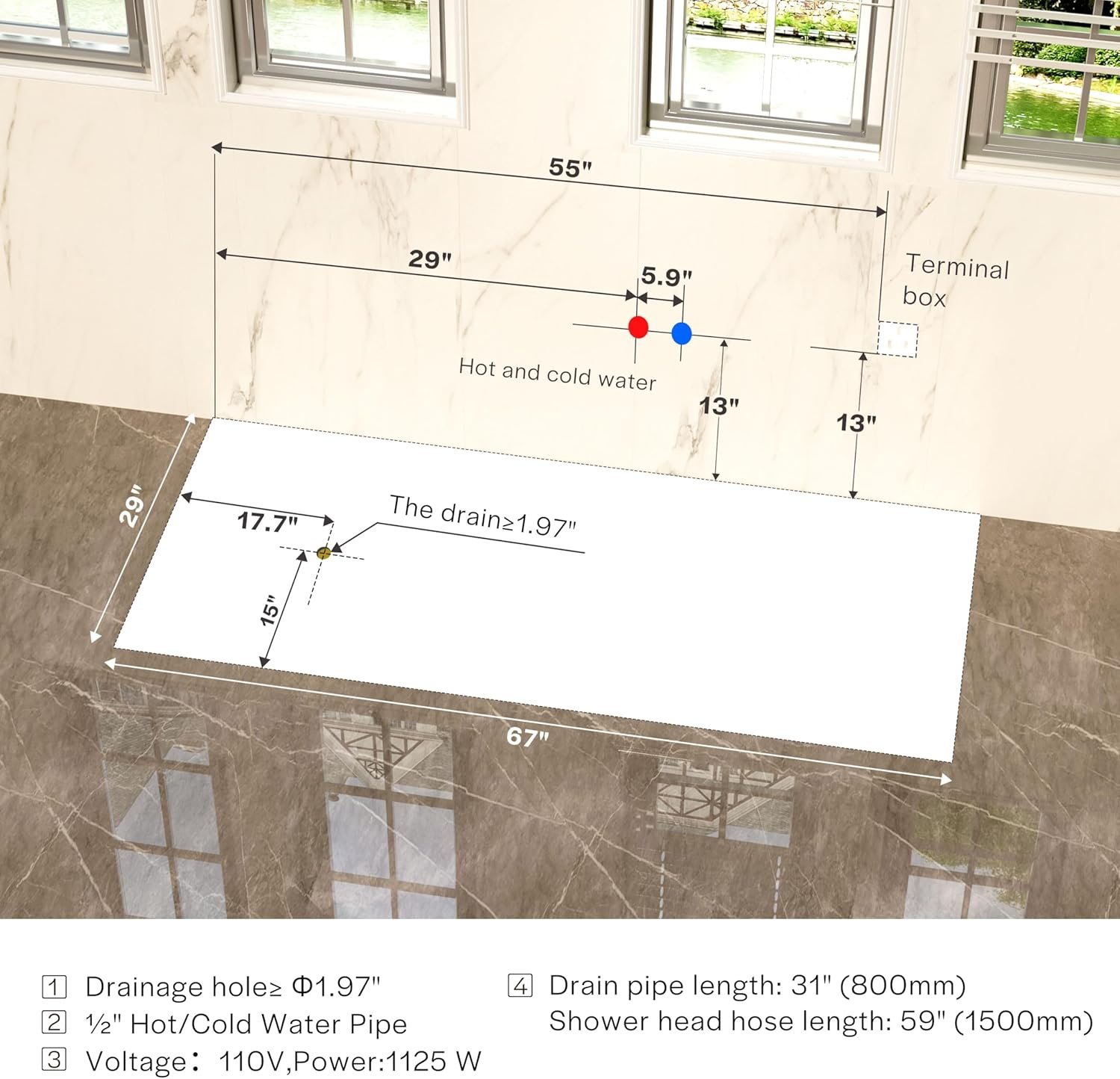 Installation Requirements: This left-sided drain tub comes with pillow, faucet,pull-out shower head (59″ hose), and 31″ drain pipe etc.It requires ½” hot/cold water connections, and a ≥1.97″ drain hole.Note: Installation demands 2 separate 110/120V, 15A plugs and connection to a terminal box, powered by two dedicated 15A GFCI circuits for safety and functionality.