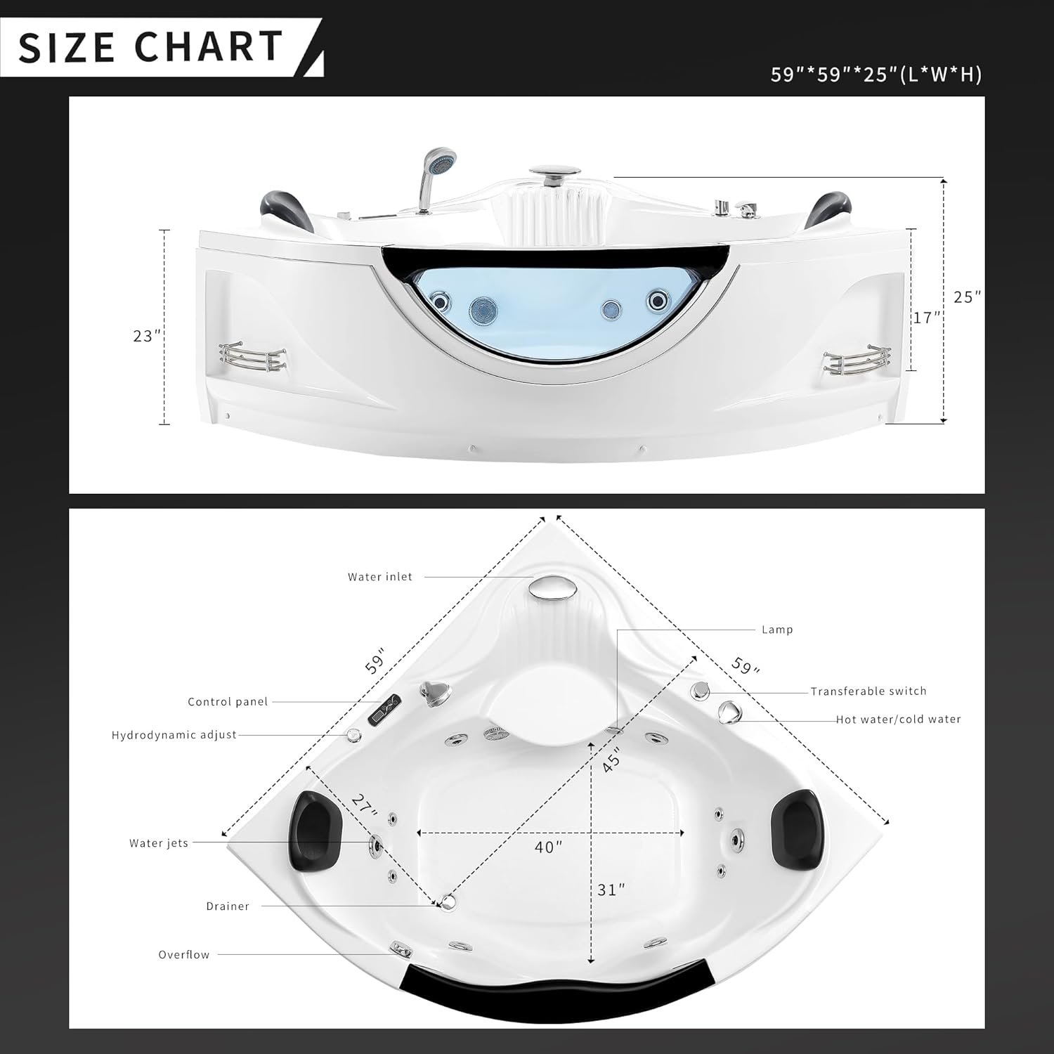 Corner Jetted Bathtub with Light:The jetted tub with hydrotherapy and chromatherapy,brings a seductive look and glamour to your space.Product Dimensions: 59.45″ W x 59.45″ D x 25.2″ H.Installed in the corner of a room to minimize the space it occupies.
