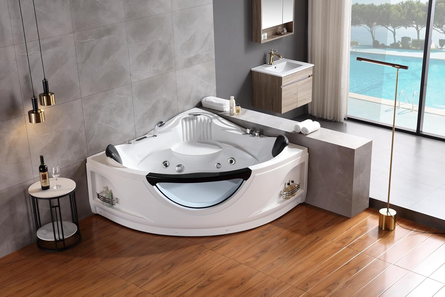 Beautiful Whirlpool Tub: We saturated the oceanic romance into our tub with the innovative triangular shape and side blue glass design, bodying forth the sea-relish joy in your bathroom.Get the easiest shortcut to nature and enjoy a pure pleasure!
