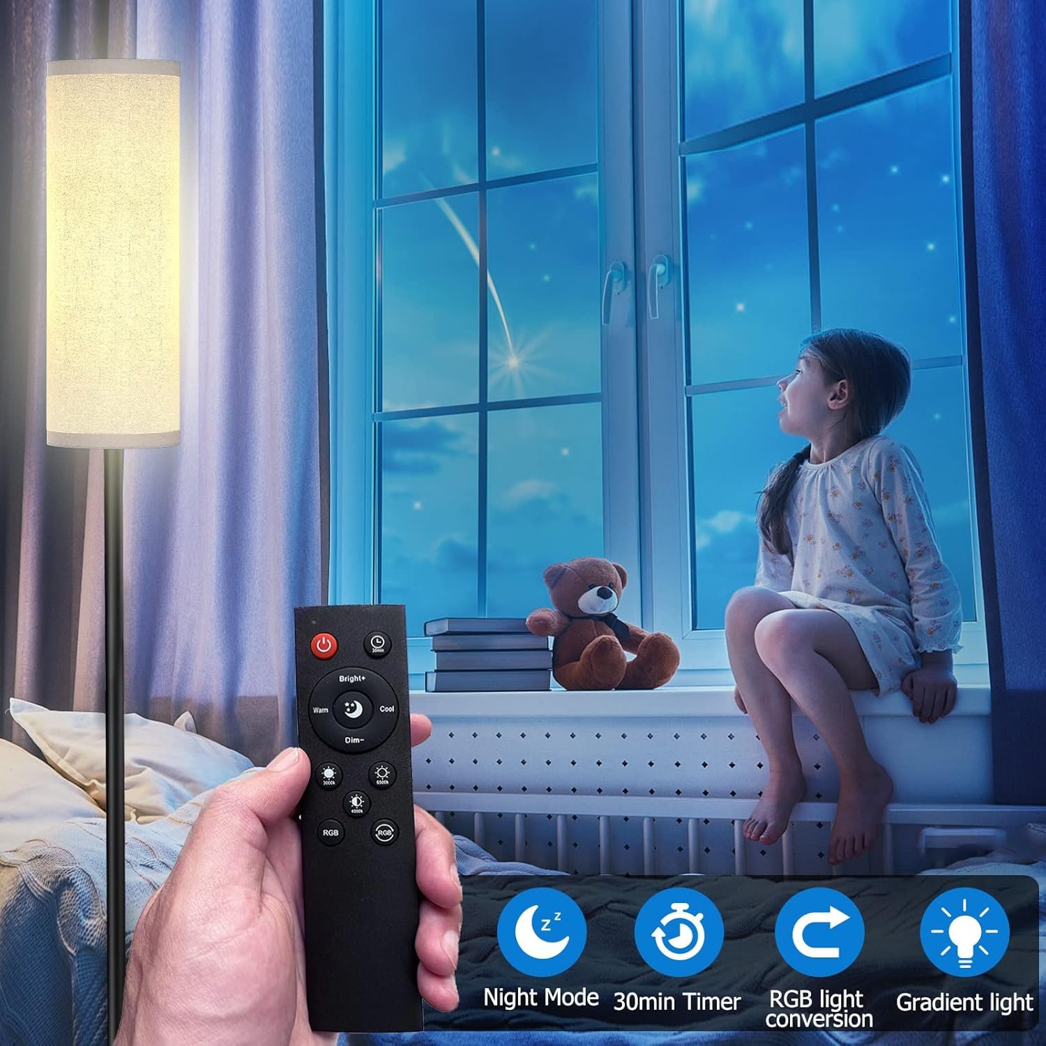 (Floor lamp for bedroom) A 30 minute timer button is set on the remote control to help you schedule the light off time in advance.